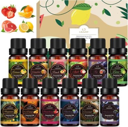 Essential Oils Set for Diffuser 12 x 10 ml, 100% Pure Fragrance Oil, Aroma Diffuser Oil Gift Set for Soap, Candles, Humidifier, SPA, Massage, Bathing, DIY – Blueberry, Lemon, Lime, Grapefruit, etc