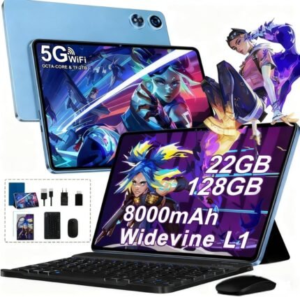 Tablet 10 Inch Android Octa-Core 22GB RAM + 128GB ROM (2TB TF), Widevine L1, 5G+2.4G WiFi, GMS, BT 5.0, 8000mAh, 8+5MP, 1280*800, GPS, Type C, 2026 Latest 2-in-1 Tablet with Keyboard, Mouse – Blue