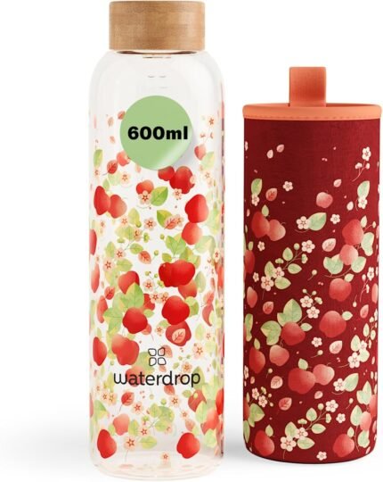 waterdrop Glass Bottle 600 ml – Drinking Bottle Suitable for Carbonated Drinks, BPA Free & Dishwasher Safe – Leak-Proof Water Bottle with Neoprene Cover – Borosilicate Glass Bottle with Screw Cap