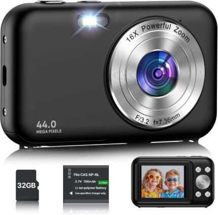 Digitalkamera, Kamera Fotokamera mit 32GB Karte, 44MP 1080P HD Kinderkamera mit 16X Digitalzoom Kompaktkamera, Wiederaufladbare Fotoapparat mit Akku, Kamera für Kinder, Teenager, Anfänger (Schwarz)