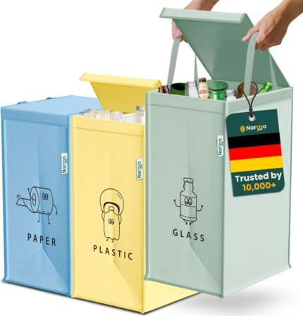 3-Way Waste Separation System – Set of 3 Waste Separation Systems for Plastic, Paper and Glass – Recycled Container 40 L with Handle – Waste & Recycling Solution – Kitchen Waste Separation