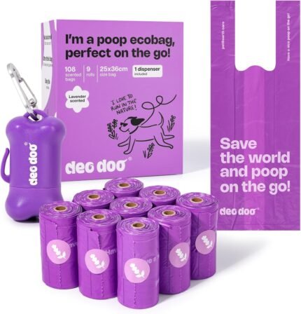 Biodegradable Dog Waste Bags with Handle and Dispenser Waste Bags for Dogs with Lavender Fragrance 108 Pieces 9 Rolls Dispenser Made of Recycled Materials Made of 50% Food Starch Leak-Proof