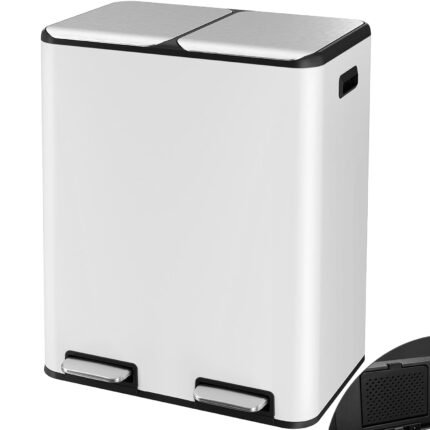 LIFERUN Rubbish Bin, 2 x 30 Litre Pedal Bin with Odour Filter, Silent Lid, Plastic Inner Bucket, Waste Separation System, Metal Double Waste Bin for Kitchen, Office, White