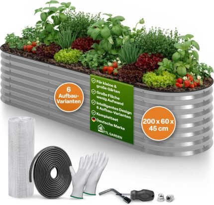 TTL GARDEN 200 x 60 x 45 cm Metal Raised Bed Fusion 6-in-1 Silver – Rust-Proof Steel Galvanised 45 cm High 60 cm Wide Corrugated Sheet Shape Oval Stable Garden Bed for Vegetables Herbs Flowers Garden