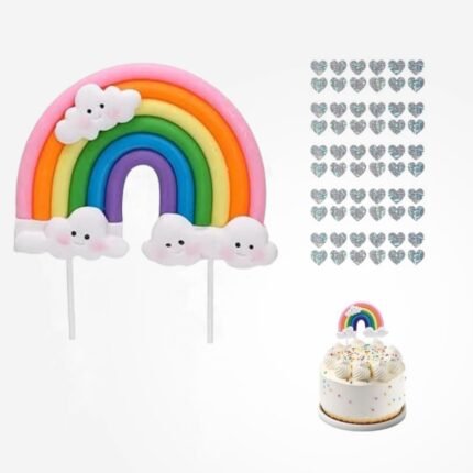 HENGBIRD Clouds Rainbow Cake Decoration, Soft Ceramic Rainbow Decoration with Silver Sticker, Safe and Non-Toxic Material, Happy Birthday Cake Decoration, Cake Decoration for Girls Boys Children’s Birthday