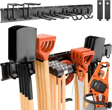 Adjustable Garden Tool Holder 120 cm, Wall Mount Garden Tools – with 3 Rails and 8 Hooks, Storage of Garden Tools and Ski Equipment, Suitable for Garage, Garden, Basement, Yard (Black)