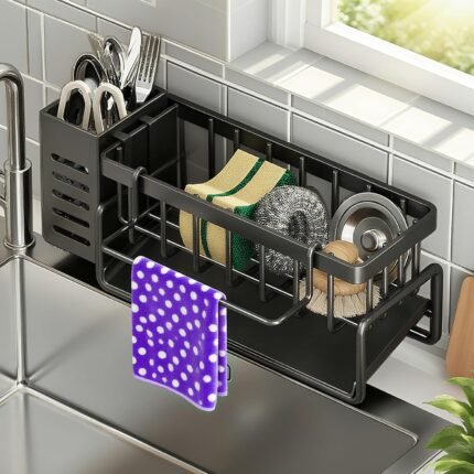 Kitchen Sink Sponge Holder – Stainless Steel Sink Organiser with Brush Holder and Self-Draining Tray, Rustproof Storage for Sponges, Soap and Kitchen Accessories