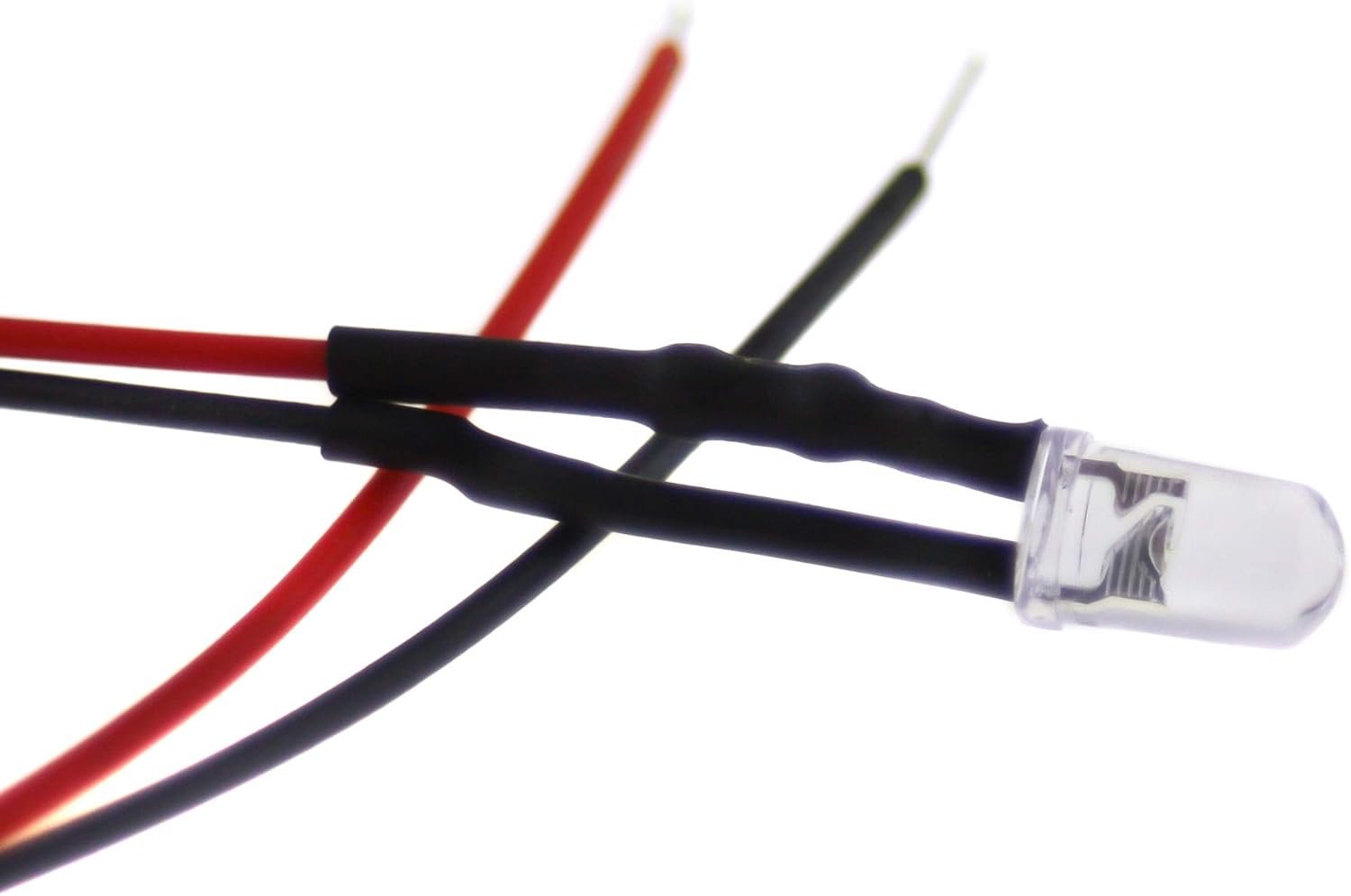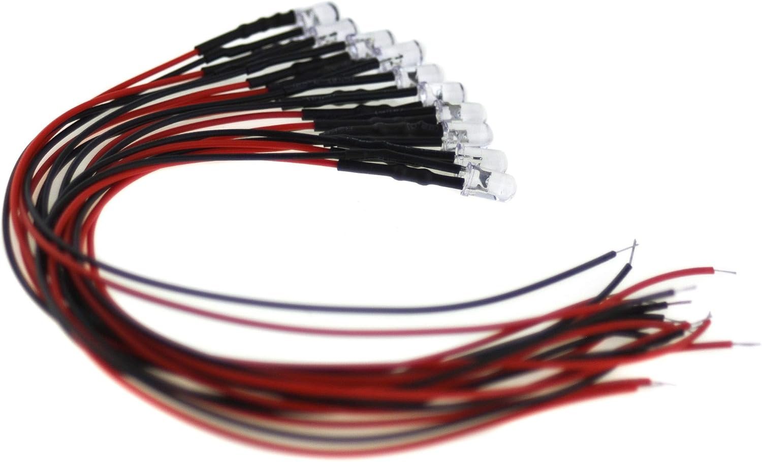 5 mm LED with resistor, 20 cm connection cable, pack of 10. In polybag. Ready to use