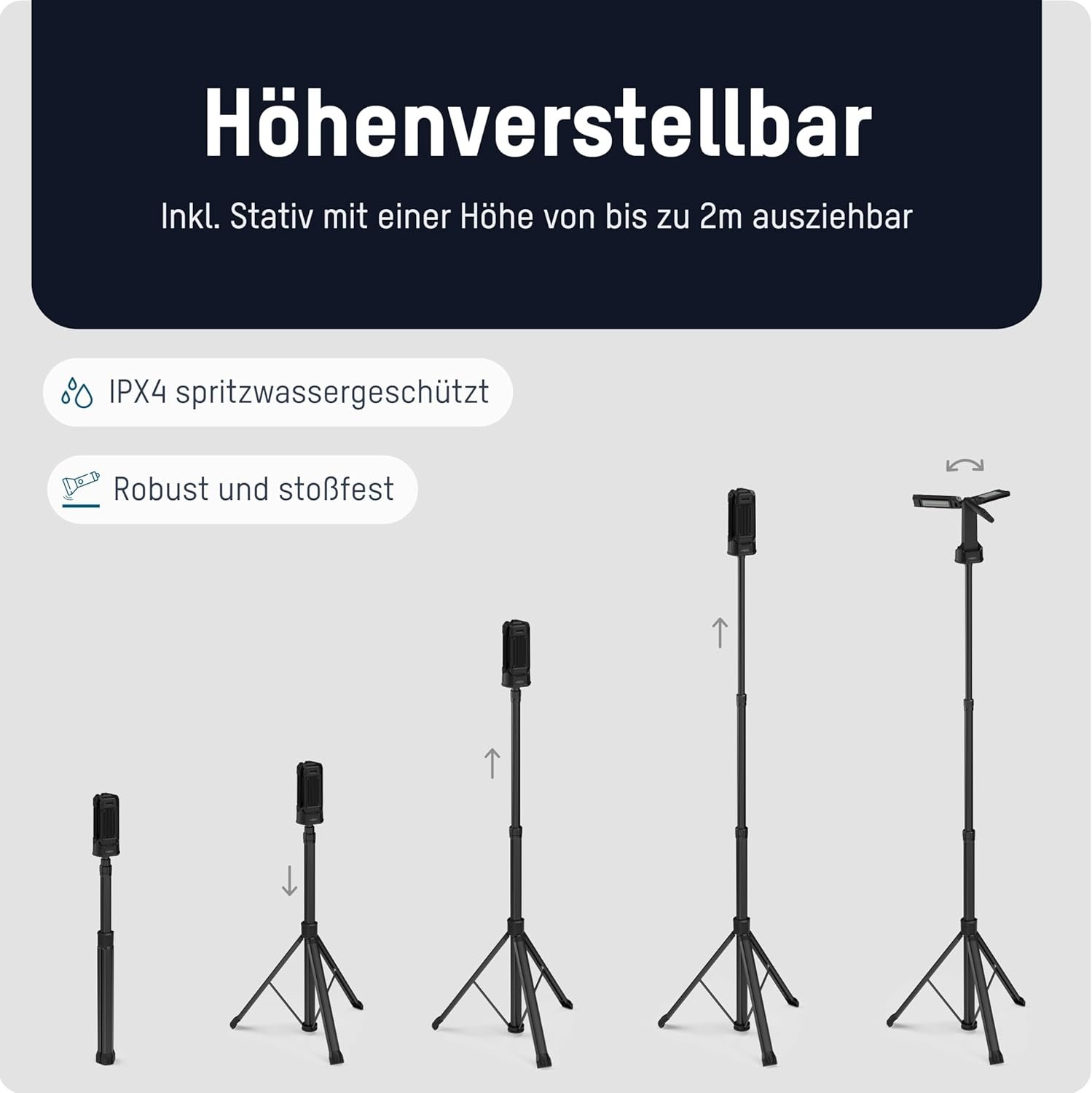 Height adjustable: The tripod supplied with the tripod is up to a height of approx. 2 m extendible and has a very stable stand