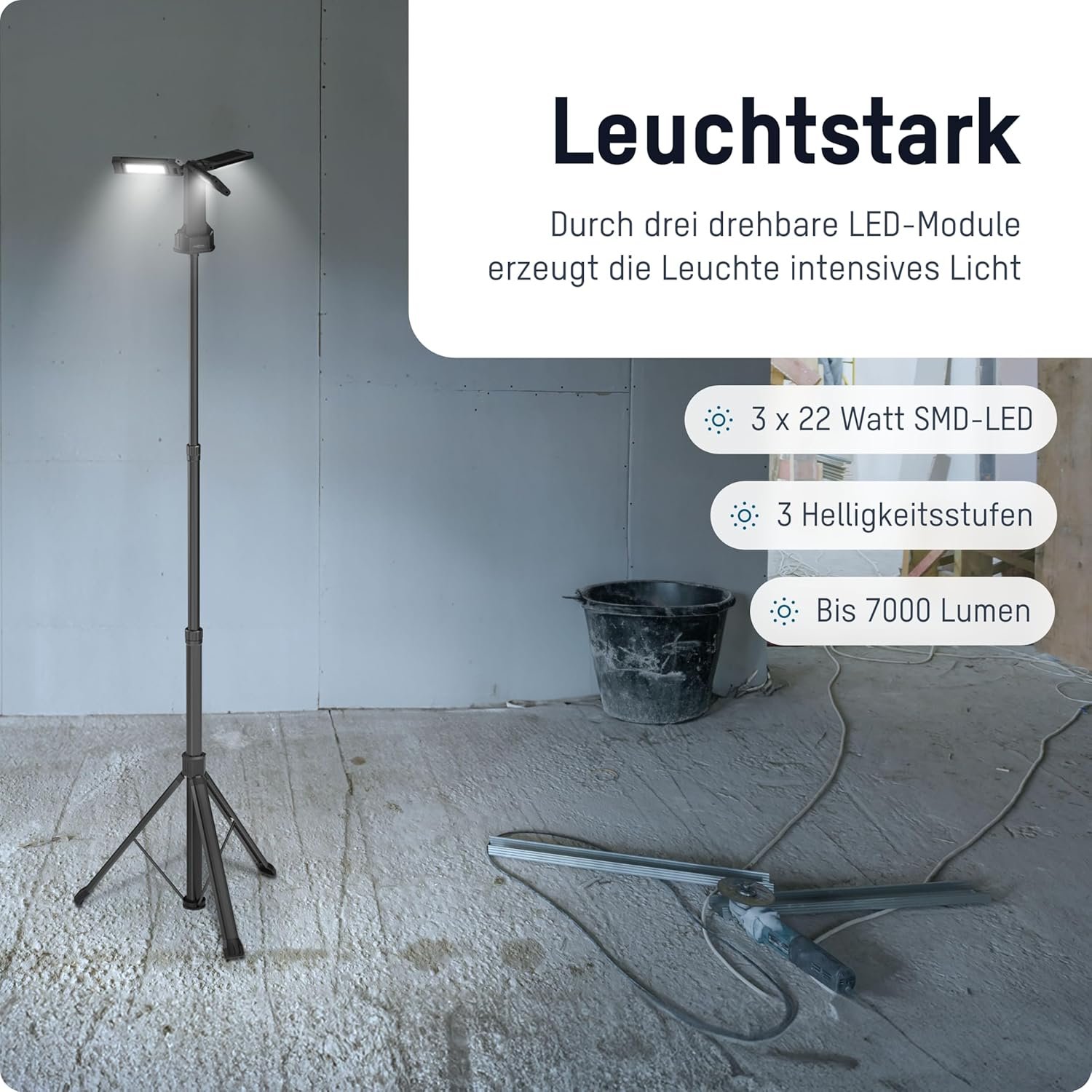 ANSMANN LED Work Light with Tripod 2 m, Robust and Very Bright up to 7000 Lumens, 3 x 22 Watt Spotlights, Battery Operated, Height Adjustable, with Hooks and Magnets