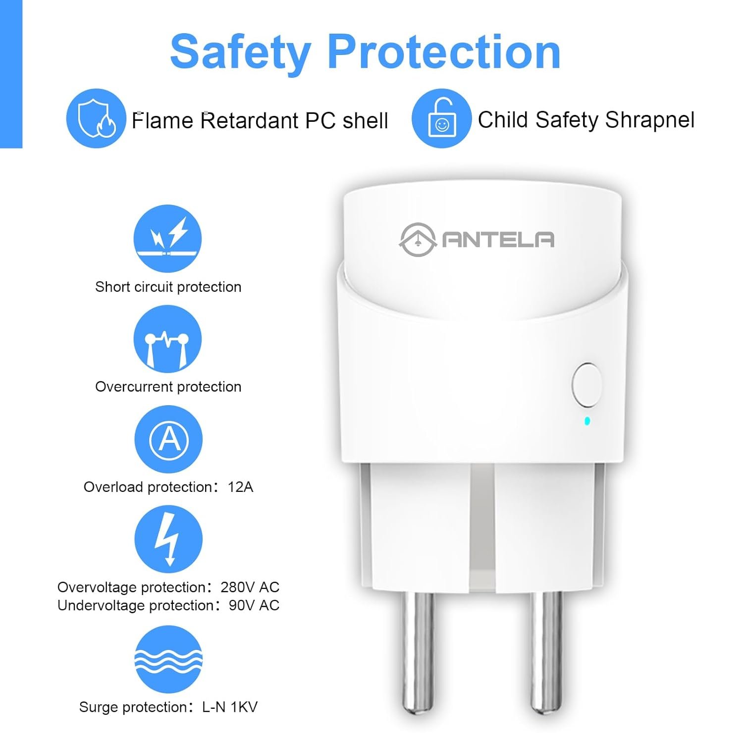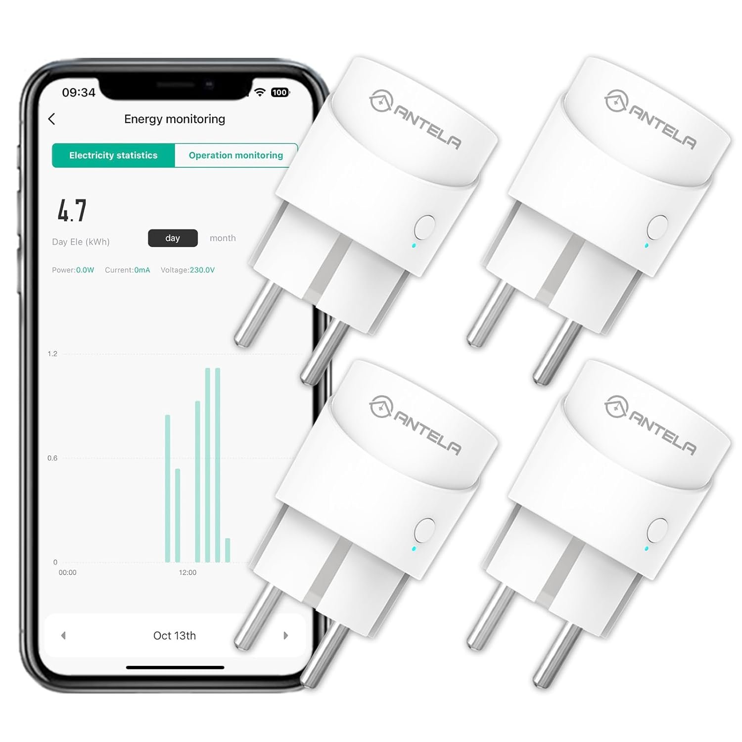 ANTELA 4 x Smart Mini Power Socket WiFi 10A with Energy Monitor 2500W Compatible with Alexa and Google Home, App Tuya/Smart Life, Timer