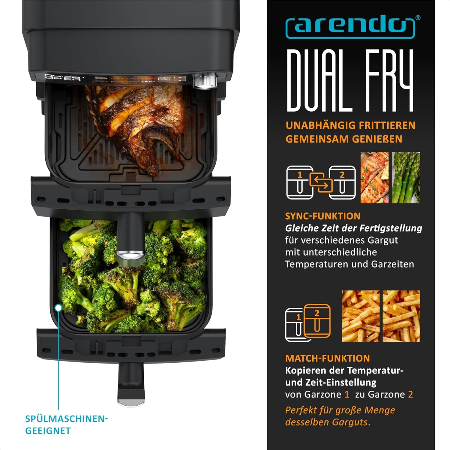 Arendo – XXL Dual Zone 2 Chambers Hot Air Fryer – 11 Litres – 2400 W – 2 Zones – 3-in-1 Airfryer Double Chamber – 8 Sensor Buttons – PFAS BPA Free – 2 Cooking Grates – 3D Convection System – Double Tier