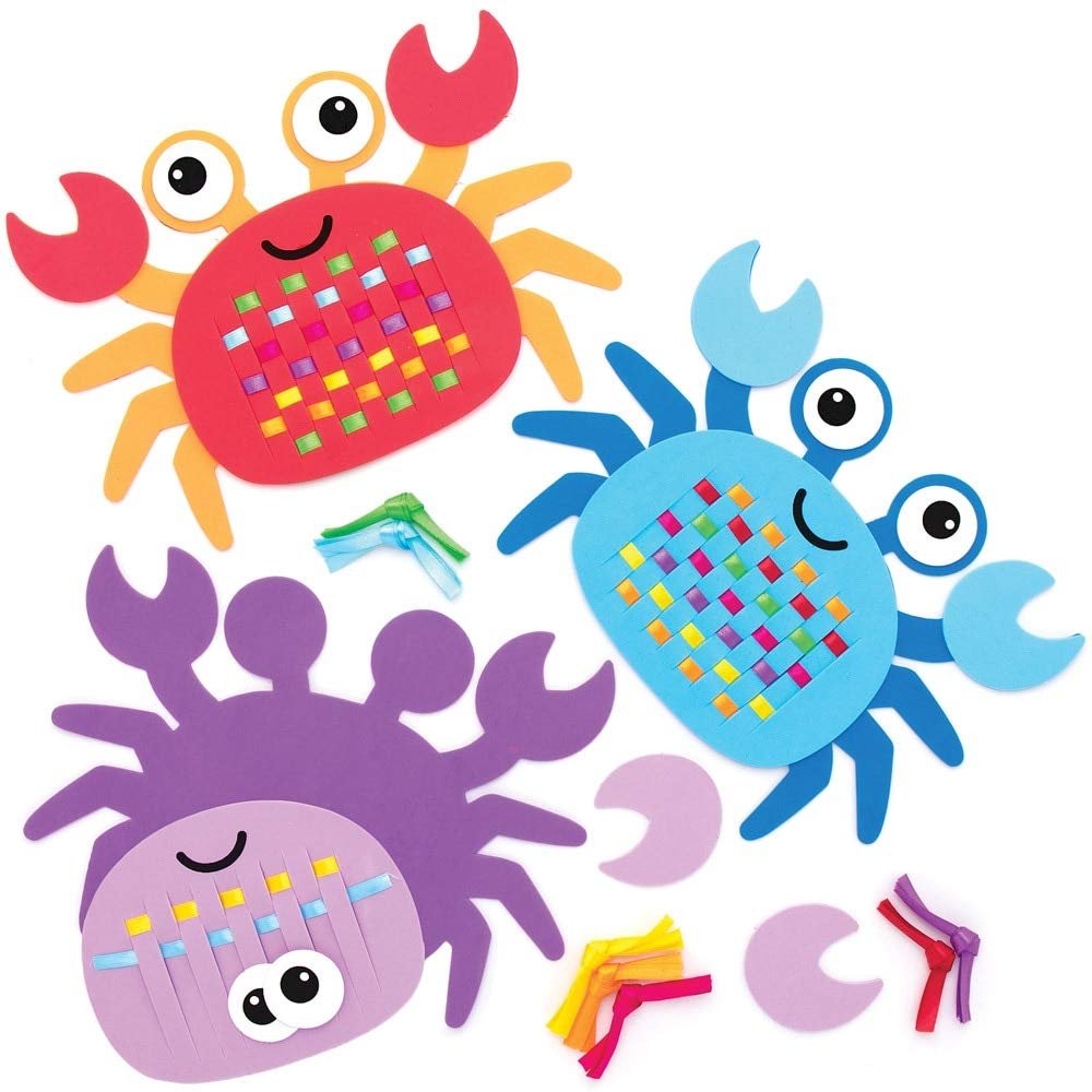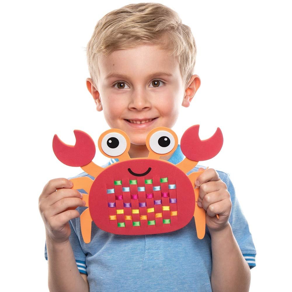 Craft Kits for Kids: Each pretty design features a different eye-catching color scheme with pre-cut slots so little fingers can easily pull the ribbon in and out. Watch the over and under pattern take shape, then assemble your crab and display it
