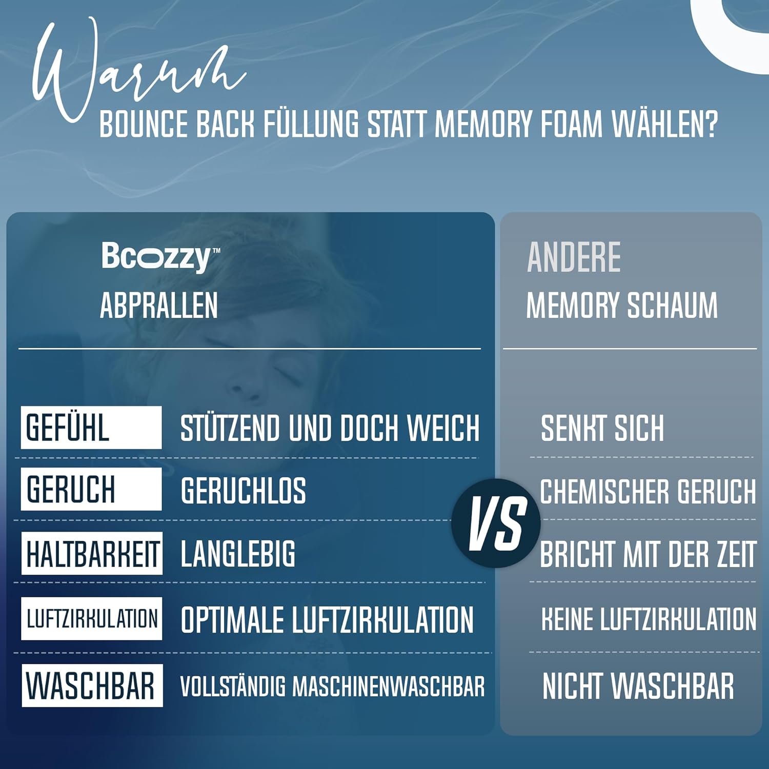 Ideal for people with neck or back pain: the BCOZZY pillow is an excellent option for people who suffer from chronic neck or back pain. The double support design is designed to keep the head and neck in a comfortable, neutral position, which can help reduce the strain on your muscles and joints. The pillow is especially useful when travelling, but can also be used at home to relieve pain and improve sleep quality.