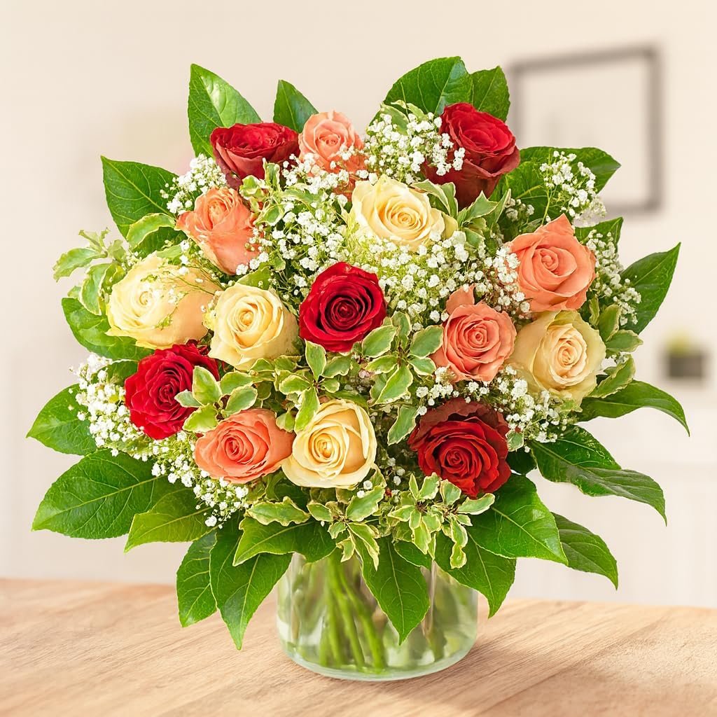 Lovingly hand-tied colourful bouquet with 12 roses, gypsophila and various cut green of lovingly hand-tied – colourful bouquet with 12 roses in the colours white, red and pink including gypsophila and various cut green of the season. This bouquet is ideal as a birthday gift and it also looks great in your own vase. Season. Ideal for a birthday