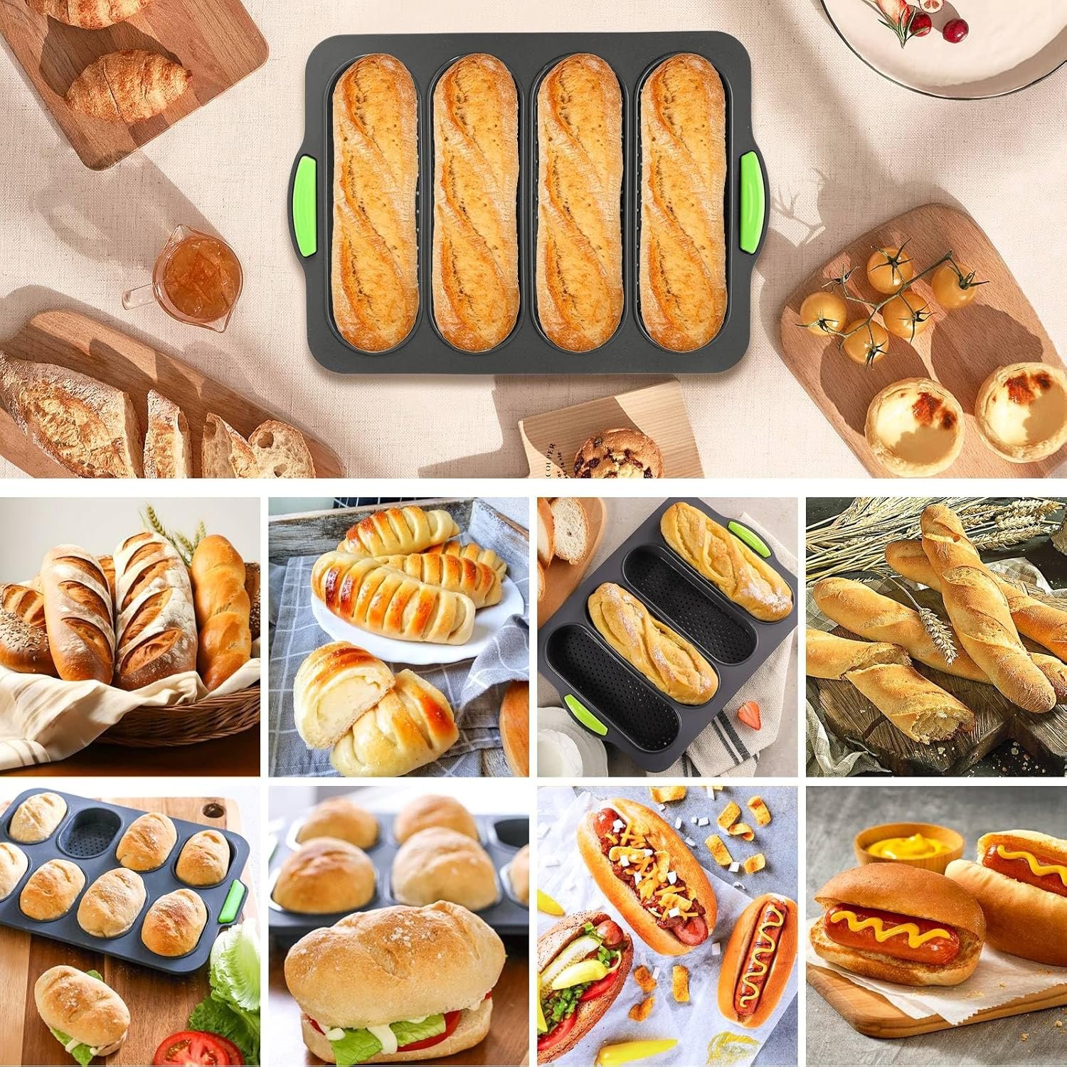 Bread Baking Mould, Pack of 2 Baguette Baking Moulds, Silicone, with 4, 8 Slots, Baking Moulds for Baguette and Rolls, Non-Stick with Spatula and Oil Brush, for Baking Baguette Trays