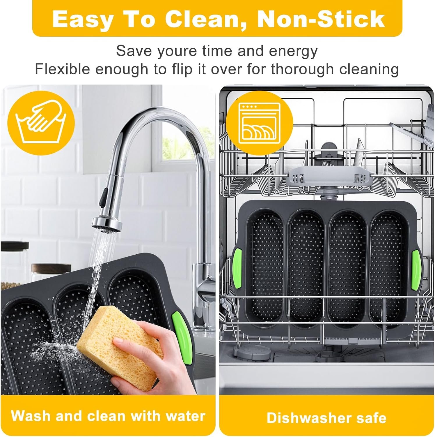 Design with handle: the silicone baguette baking mould has a humanised handle on the edge, which is easy to take and use and has a certain scalding and heat insulation performance. Can be used in the dishwasher.