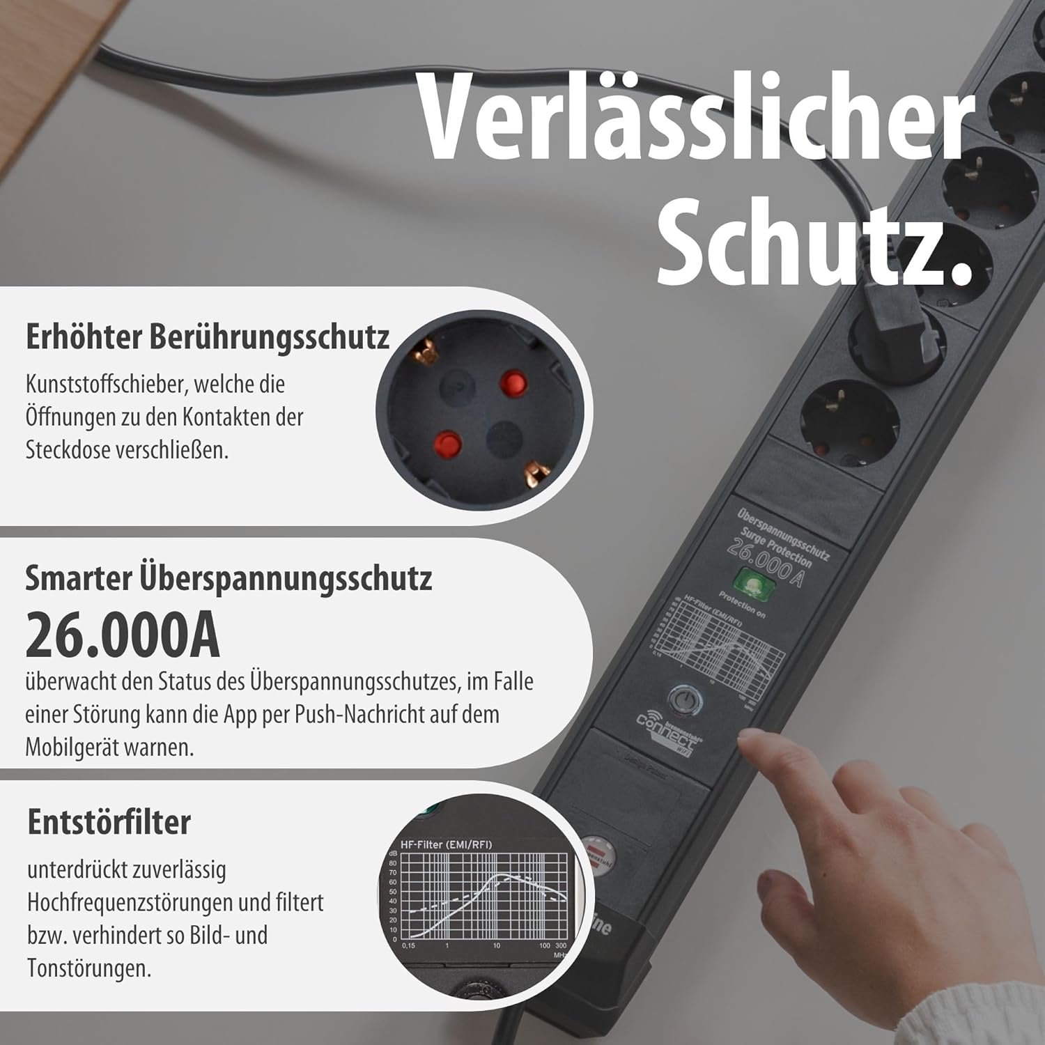 Multiple plugs with practical mounting eyelets for wall mounting and rubber feet for a secure stand