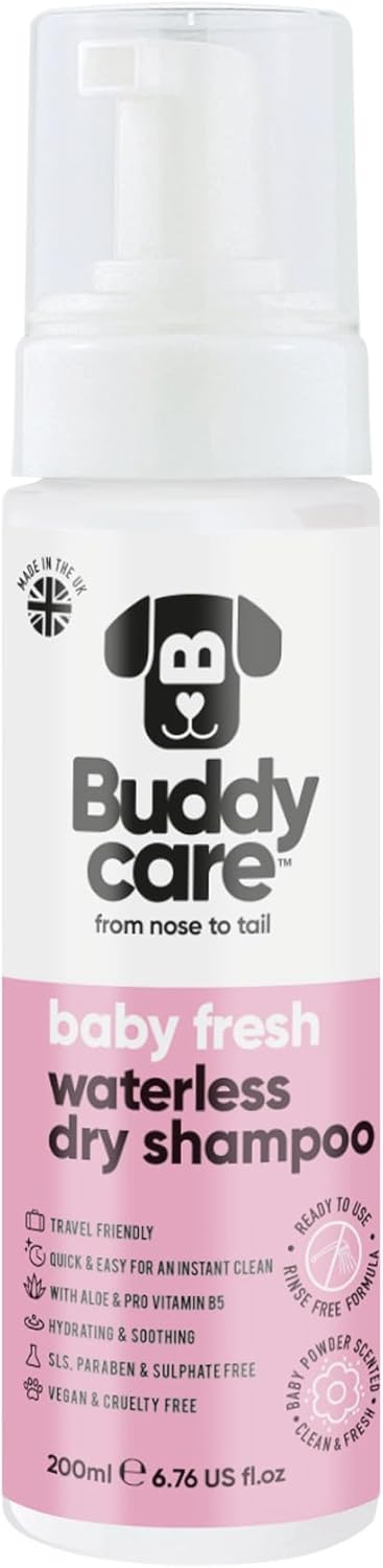 Buddycare Waterless Dry Shampoo for Dogs (200 ml) – Baby Fresh Scent, Sensitive Skin, Natural Dog Dry Shampoo without Rinse, for Clean & Fresh Coat, All Breeds & Sizes