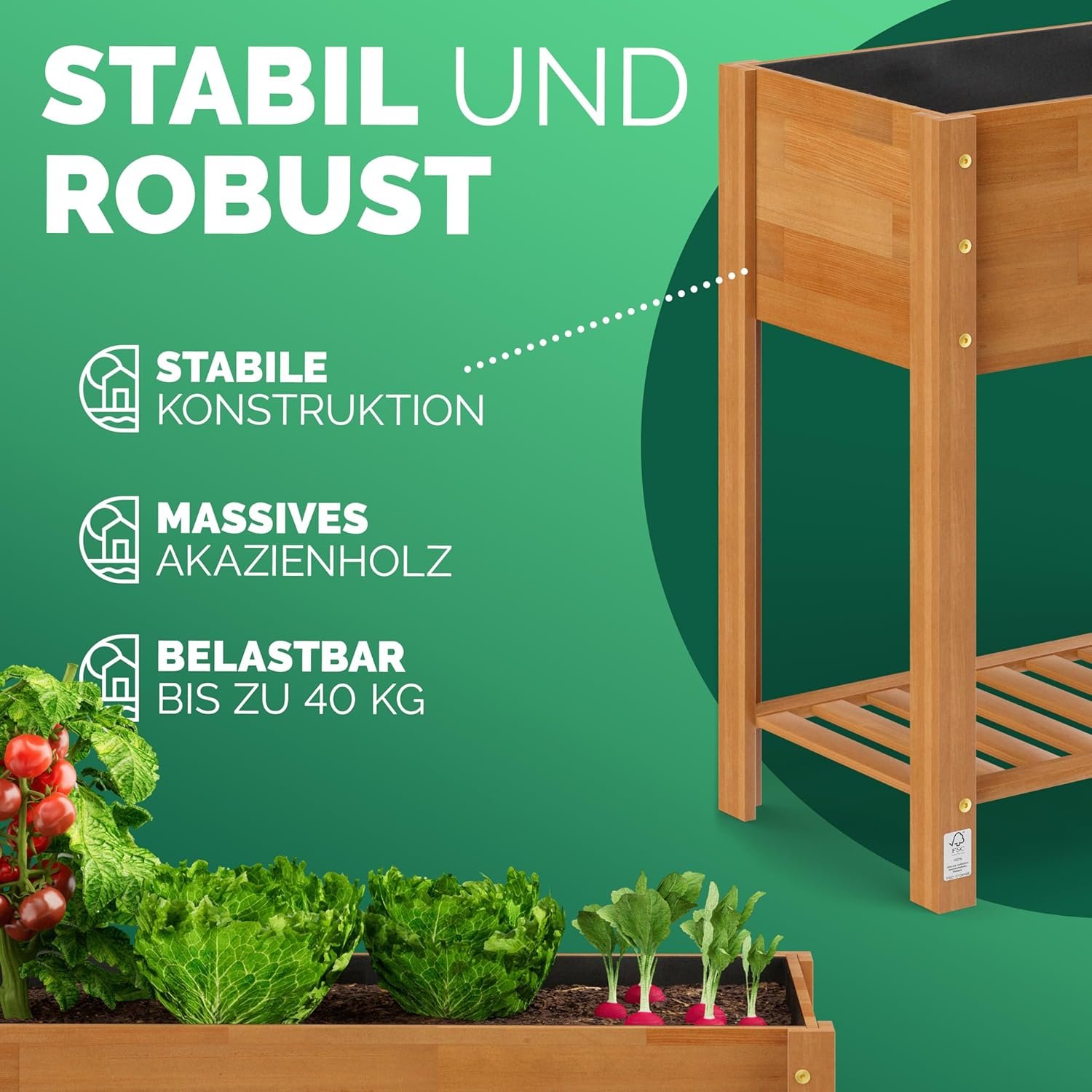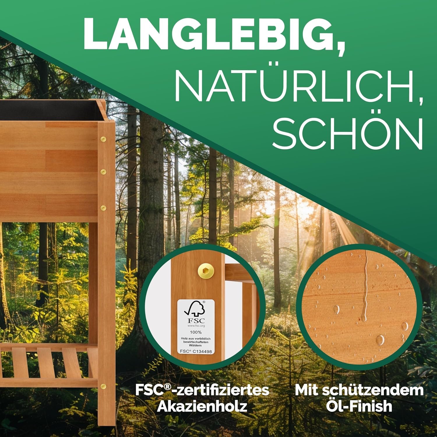 Robust and weatherproof – the raised bed, made from FSC-certified, weather-resistant acacia wood, impresses with its stability and durability. The oil finish protects the wood from the elements, pests and from rotting.
