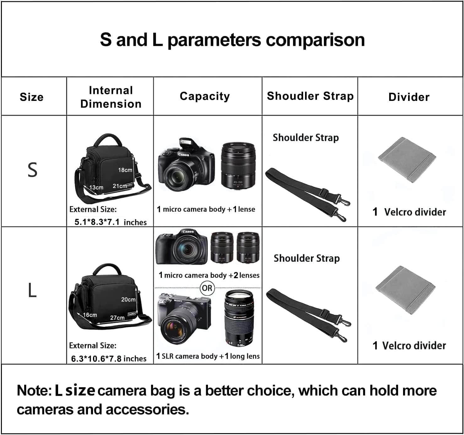 【Dimensions and Capacity】Outer dimensions: 8.3 x 5.1 x 7.1 inches. Internal dimensions: 7.4 x 4.3 x 6.3 inches; fits 1 DSLR camera/micro camera+1 replacement lens + mobile phone + filter + SD card. Bag only! (Device and accessories are not included).