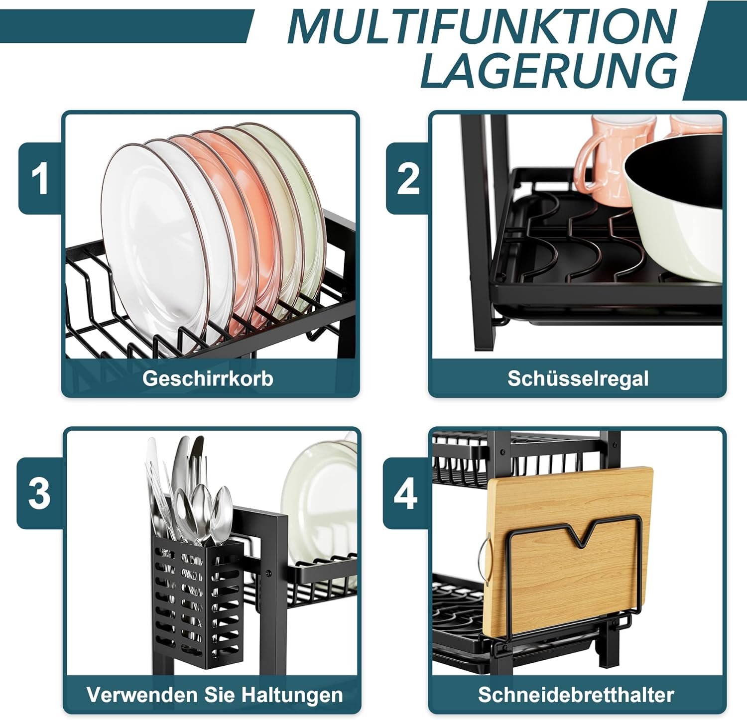 Say goodbye to small space: The dish drainer uses the vertical space of the kitchen, divided into two levels, which also makes the kitchen utensils tidy. Takes up a smaller kitchen space, stores more kitchen accessories and significantly increases the area of the kitchen.