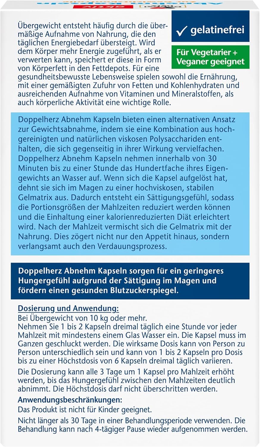Doppelherz Slimming capsules are a medical device and offer an alternative approach to weight loss by containing a combination of highly purified and natural viscous polysaccharides that multiply each other in their effects. One capsule absorbs hundreds of times its own weight in water within 30 minutes to an hour. When the capsule has dissolved, it expands into a highly viscous, stable gel matrix in the stomach. This creates a feeling of satiety, so that the portion sizes of meals can be reduced and adherence to a calorie reduced diet is facilitated. After the meal, the gel matrix mixes with the food. This not only delays the appetite, but also slows down the digestive process. Doppelherz slimming capsules ensure a lower feeling of hunger due to satiety in the stomach and promote healthy blood sugar levels. The Doppelherz slimming capsules are intended for adults aged 18 and over who have more than 10 kilos of excess weight or a body mass index (BMI) of 28 or more. To achieve good results, it is recommended to use the capsules as part of a diet with reduced calorie intake. Take 1 to 2 capsules three times a day one hour before each main meal with at least one glass of water. The capsule must be swallowed whole. The effective dose may vary from person to person and can vary from 1 to 2 capsules per dose to a maximum dose of 6 capsules three times a day. The dosage can be increased by 1 capsule per main meal every 3 days until the feeling of hunger decreases significantly between main meals. The maximum dose must not be exceeded. The product is suitable for vegetarians and vegans as it is based on plant ingredients.