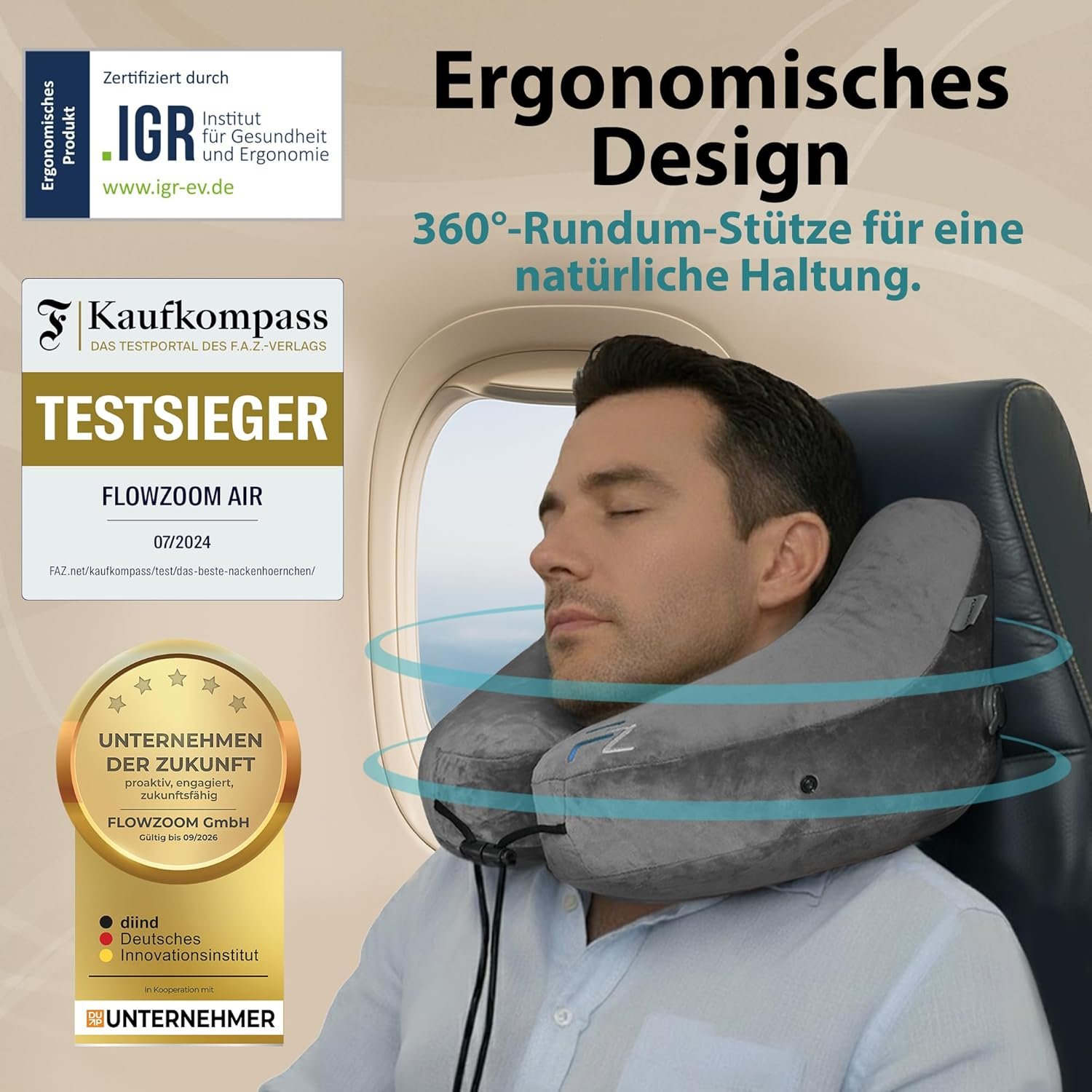 FLOWZOOM AIR Inflatable Travel Pillow for Airplane – Inflatable Neck Pillow for Travel with Hood – Flight Pillow with 360° Support – Airplane Pillow – Ultralight Travel Neck Pillow – Grey – Size L