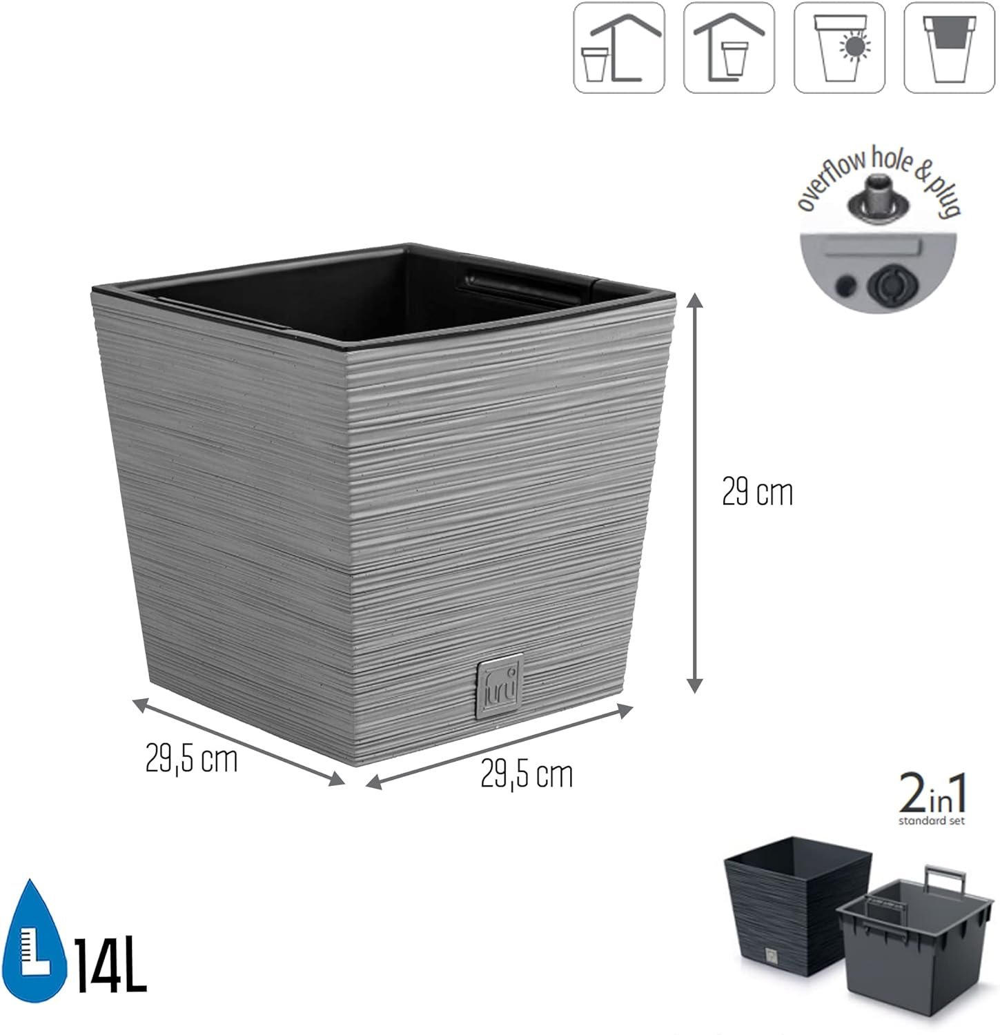 Material: plastic | length: 29.5 cm | width: 29.5 cm | height: 29 cm | pot: volume: 19 litres | insert volume: 14 litres.