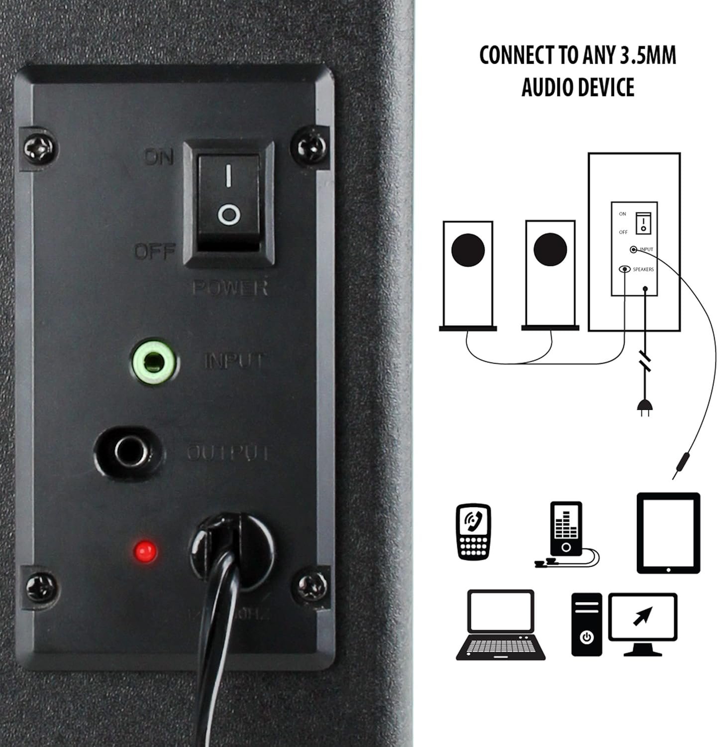 AUX INPUT: With this 2.1 speaker set, you can easily play music on any compatible device with a 3.5 mm AUX input or via the headphone port.