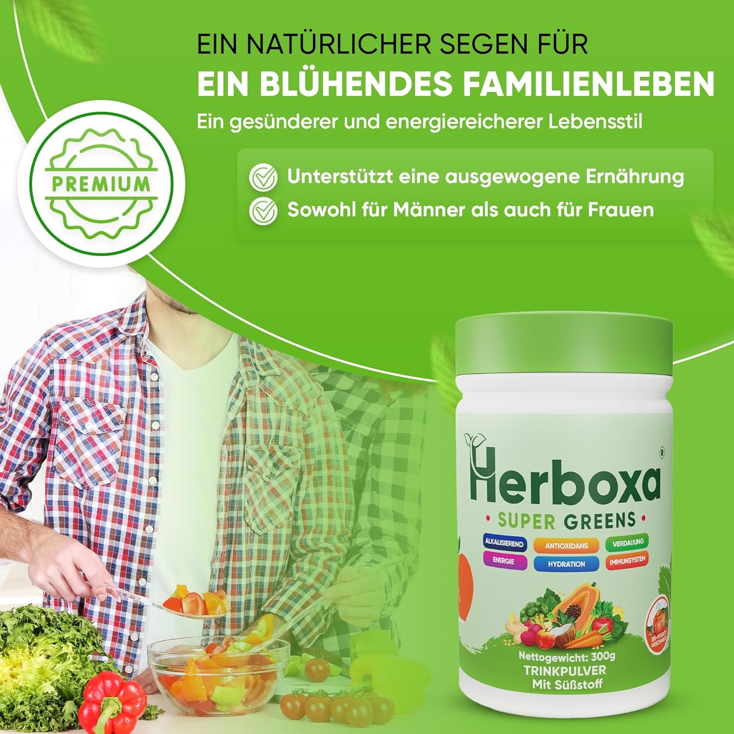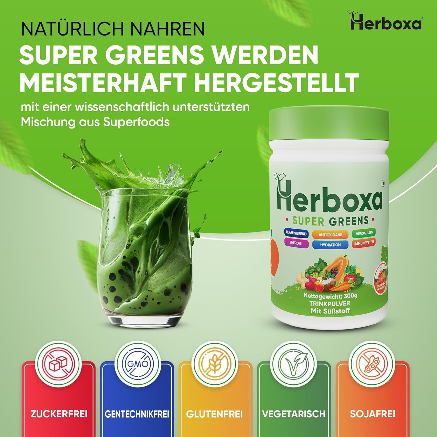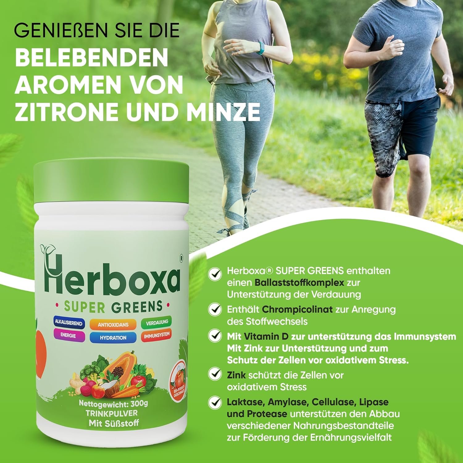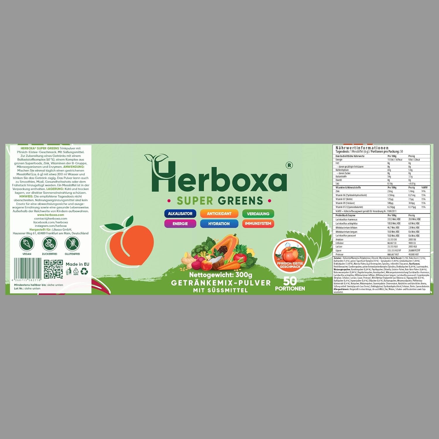Herboxa Super Greens has been developed with great care to be a valuable addition to your daily diet. Our goal is to offer you a high-quality blend of natural ingredients that will help enrich your diet in a variety of ways. Our formula includes a green superfoods complex that contains a range of nutrient-rich ingredients such as spirulina, wheatgrass and chlorella. These superfoods are known for their nutritional benefits and offer a wealth of vitamins, minerals and antioxidants that can help support your body. In addition, we have added a special digestive enzyme blend that contains enzymes such as lactase, α-amylase, cellulase, lipase and protease. These enzymes support the digestive process and help absorb nutrients from your food more efficiently. Enjoy the refreshing aromas of ice peach or lemon mint while enjoying your drink. We have strived to use the best natural ingredients to ensure that every sip is a treat. With Herboxa Super Greens, you can be sure that you are supplementing your diet with high-quality natural ingredients to support your well-being. Whether you are looking for an extra dose of nutrients or simply want to enrich your diet with the benefits of superfoods, Herboxa Super Greens is the ideal choice for those who value quality and naturalness. Experience the power of nature in every sip and feel vitalised and strengthened for the day.Category: Dietary SupplementOrigin: This product is made in the EU from imported and domestic ingredients. Net amount of food: 300 g (50 servings). Daily dose in a jar: 50Instructions for use of the product: As a dietary supplement, take 1 measuring spoon (6 g) daily, preferably with a meal. Allergenic information: This product has been assessed for the presence of the following allergens in accordance with Annex II of Regulation (EU) No 1169/2011: Gluten, milk, egg, nuts, peanuts, soy, fish, celery, sesame, lupine, crustaceans, mollusks, sulfites, mustard. Allergen declaration: None of these allergens are included in this product. Supplement: Relevant information on the components possibly contained in the product in relation to any information according to Regulation (EC) No. 1924/2006, Regulation (EU) No. 828/2014 and Regulation (EU) No. 1169/2011: No animal origin / vegan / vegetarian: This certifies that no animal raw materials are used in the production of the Herboxa Super Greens dietary supplement. Sugar-free: This certifies that all raw materials used and uncontaminated during the manufacturing process of the Herboxa Super Greens dietary supplement contain no more than 0.5 g of sugar per 100 g or 100 ml. Gluten-free: This certifies that all raw materials used and uncontaminated contain no more than 20 mg/kg of gluten during the manufacturing process of the Herboxa Super Greens dietary supplement. GMO-free: This certifies that the Herboxa Super Greens dietary supplement and all raw materials used during the manufacturing process do not contain ingredients made from genetically modified organisms. Storage conditions: Store at room temperature. Batch number / best before date: Ice / peach aroma – LOS 5439001 / BB: 01/2027Notifications from the BFSA: Ice/peach aroma: BFSA: П222400747 / 15.02.2024Customer information: The product is made for Likasso GmbH, Hausener Weg 61, 60489, Frankfurt am Main, Germany. Packaging material: Glass PET / cap HDPERegulatory information: This product fully complies with EU regulations for dietary supplements and covers all aspects from the safety and quality of ingredients to accurate labelling and health claims. It complies with the latest EU standards for nutrition information and consumer transparency.