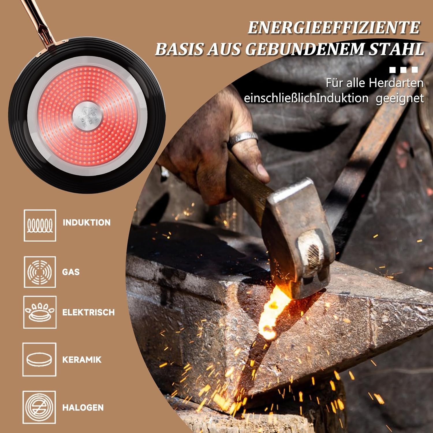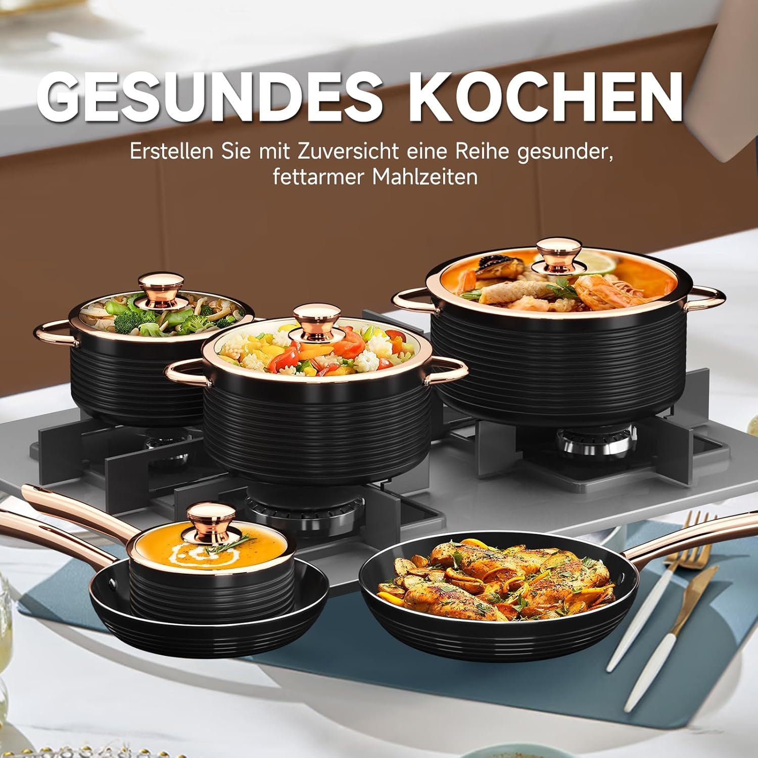 Durable and energy efficient: the cookware set features a stylish ribbed surface and a robust aluminium body with a 3 mm thick construction. Durable and torsion-resistant, with a three-layer composite base that heats up quickly and distributes heat evenly for excellent cooking results. It is compatible with gas, electric, ceramic, glass, stove, induction hobs and more.