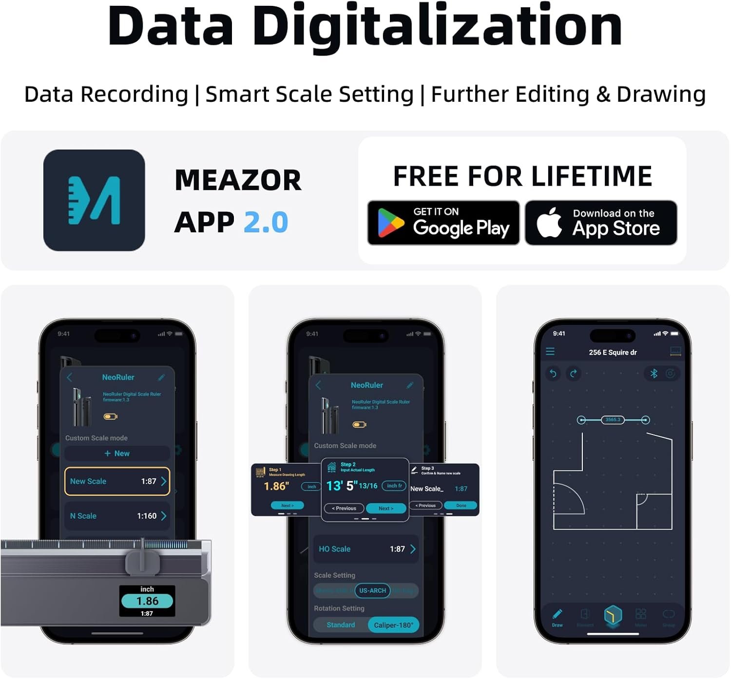 Free App via Bluetooh: Transfer measurement data to Meazor app and continue with further editing and drawing to track data. Export to CAD files dxf. pdf jpg with ease. Create and save unlimited scale lists in the MEAZOR app and upload them to NeoRuler at any time