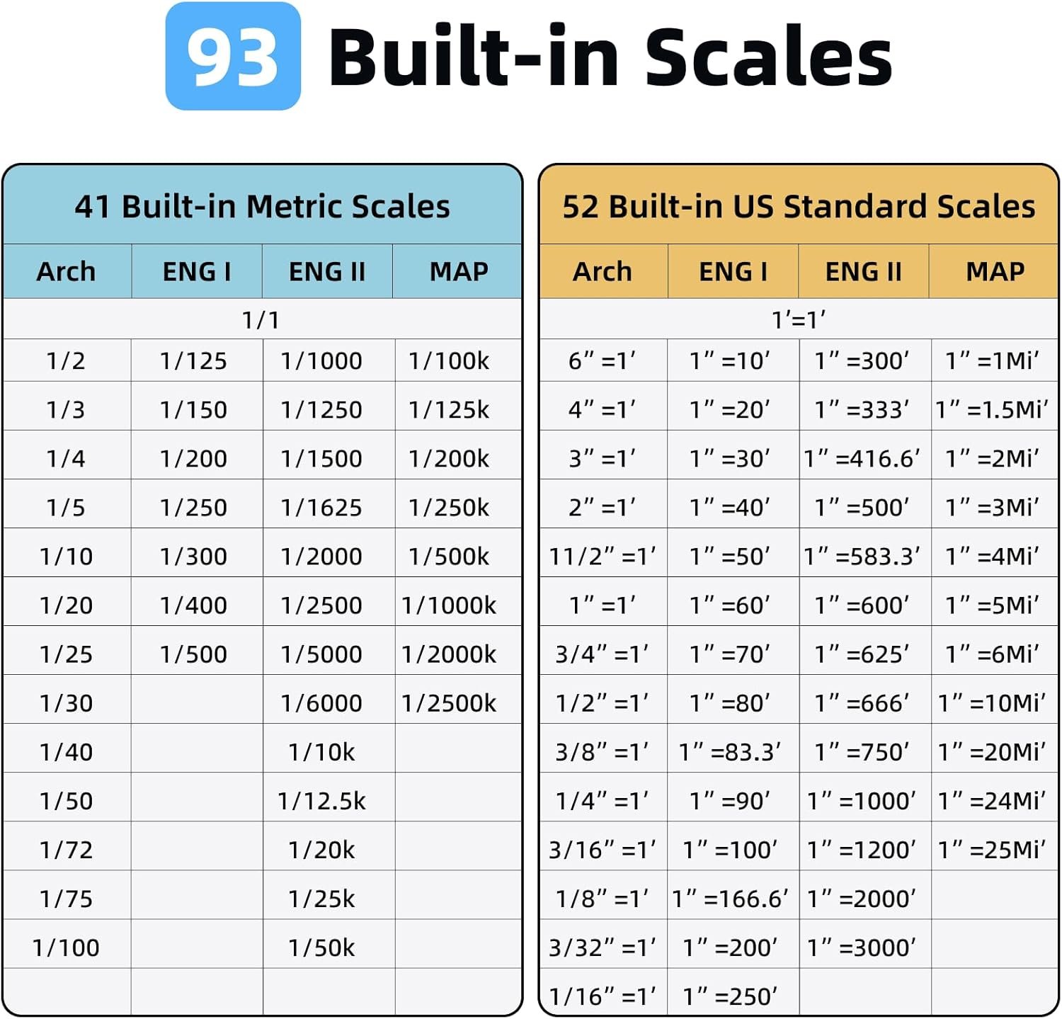 93 BUILT-IN SCALES – NeoRuler offers 93 built-in scales for maximum versatility. Multiple units: decimal feet, foot inches, decimal inches, yards, millimeters, meters, kilometers