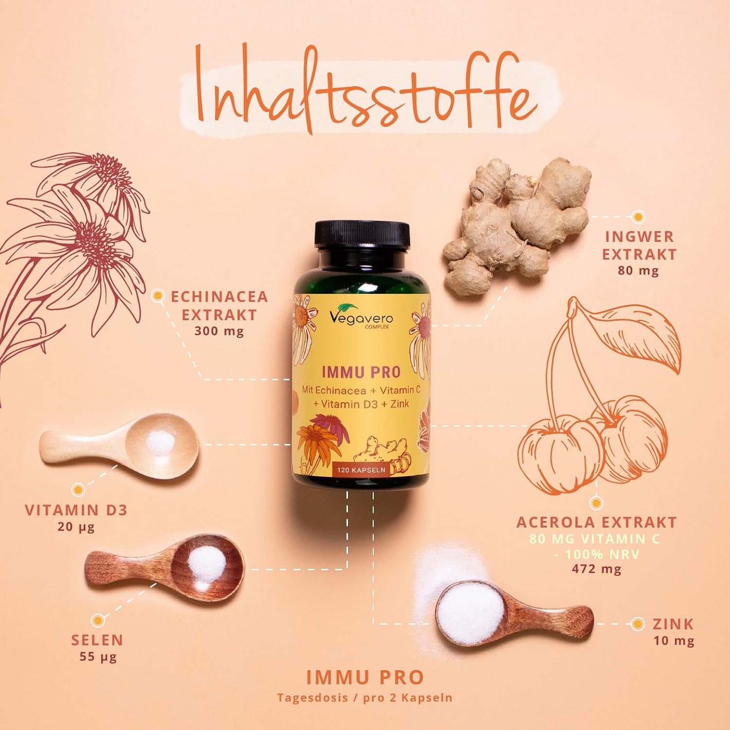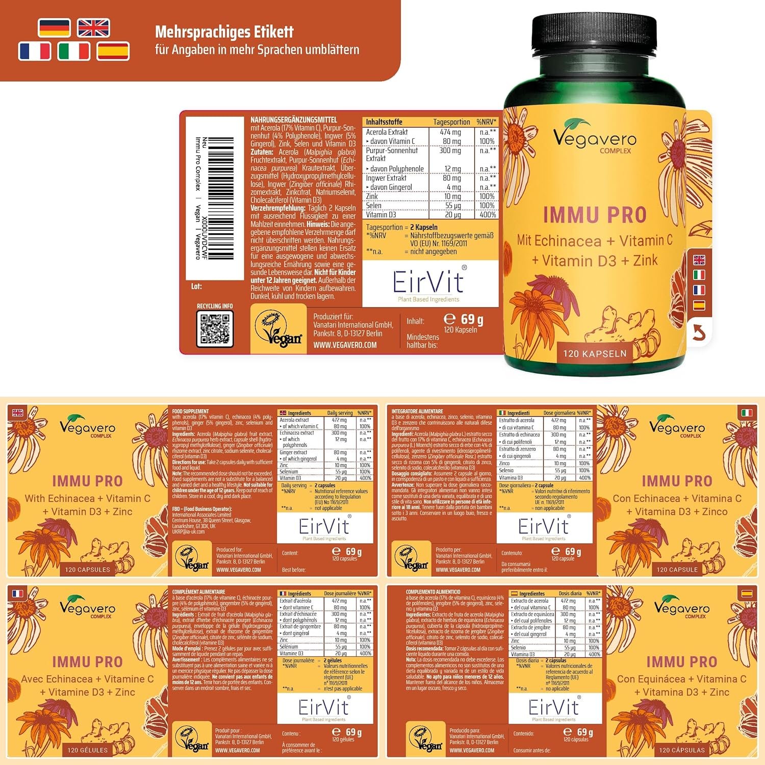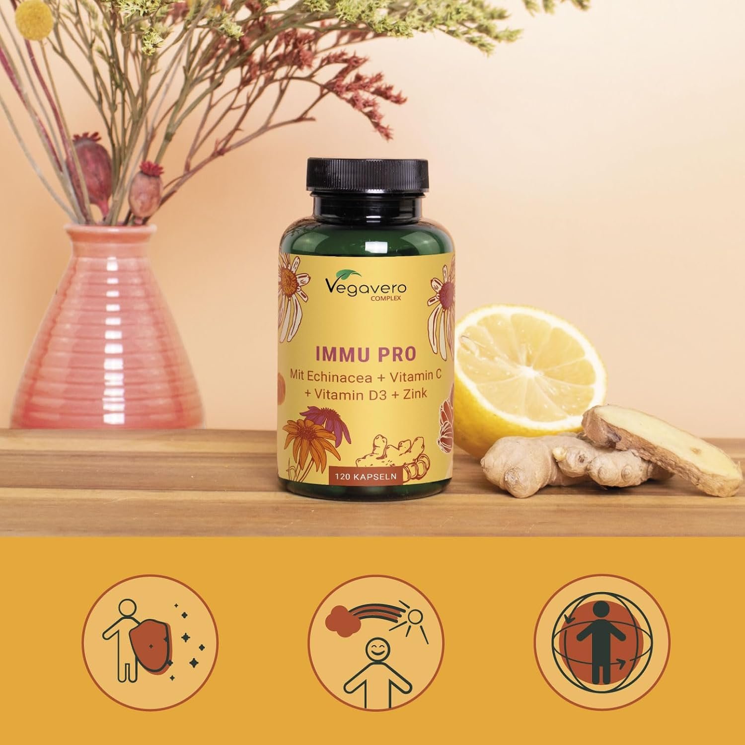 Immune System Complex Vegavero | With Echinacea, Vitamin C, Vitamin D3, Selenium, Ginger and Zinc | 120 Capsules | Strengthen Defences* | Vegan