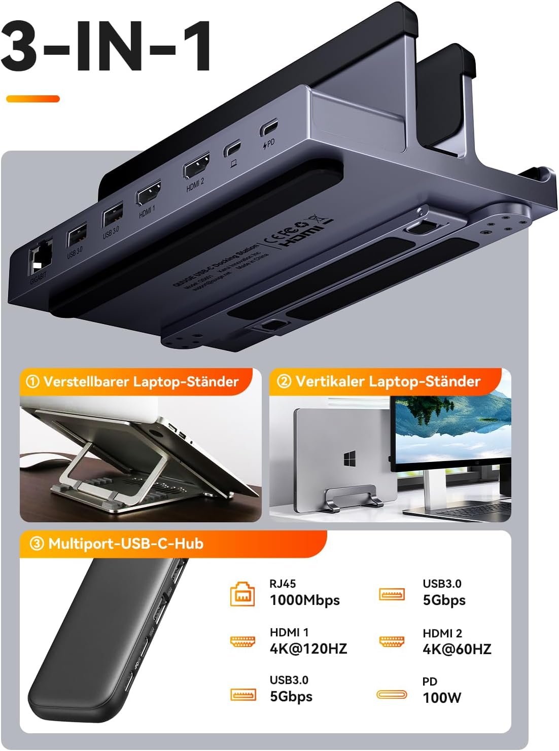 2-in-1 stand style dock: the QUUGE USB C dock features a 2-in-1 design of stand and dock, which can be used as a desktop docking station for laptops or as a laptop stand. Vertical placement can save desk space. Horizontal placement can effectively increase the visual height of the laptop display, so you don’t have to lower your head when you use it, reducing pressure on the neck and improving work efficiency.▼Note: Supports vertical placement of laptops with a thickness of 2cm or less when the lid is closed.