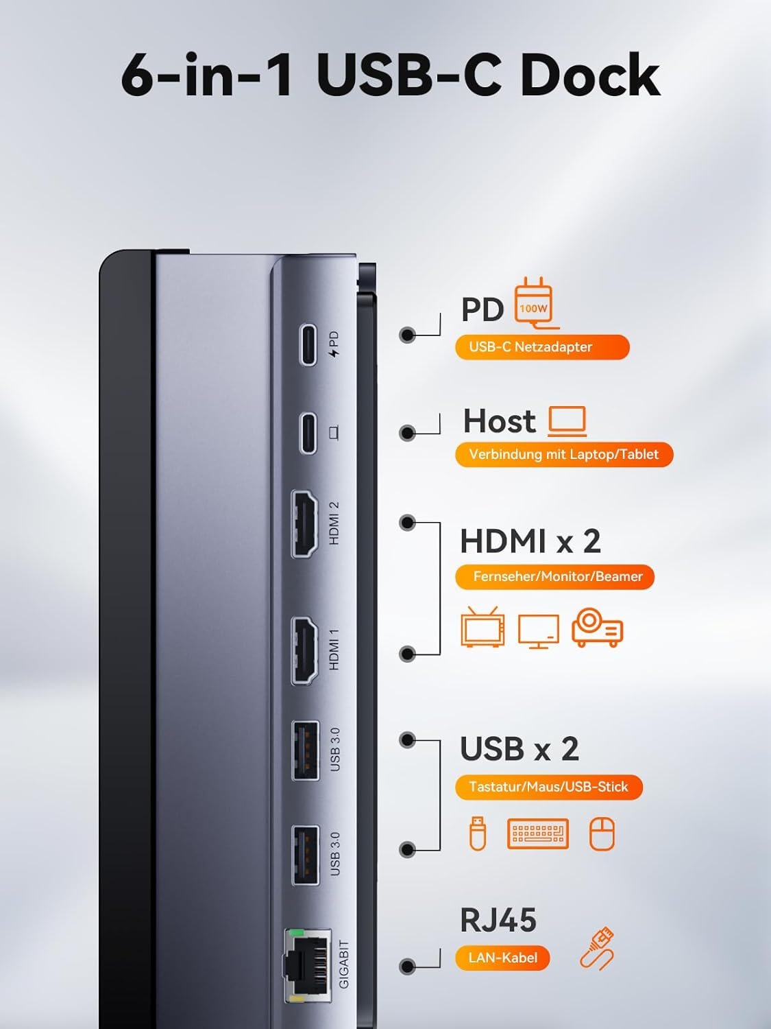 7-in-1 USB C dock: Simply plug the upstream interface of the laptop docking station into the Thunderbolt 3/4 interface of the laptop to add 2 HDMI ports (single 4K@120Hz), 2 USB 3.0 ports, 1Gbps Ethernet input and 100W PD charging port to thin and lightweight laptops such as Mac. 6 Frequently used interfaces meet the requirements for connecting multiple devices and reduce interface damage caused by repeated plugging and unplugging