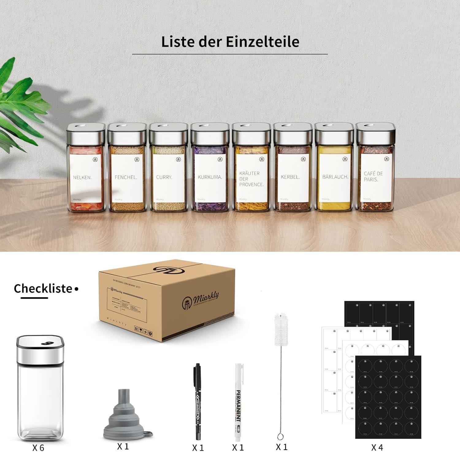 Miorkly 6 Square Spice Jars, 120 ml Spice Jars Set with Shaker Insert, Spice Shaker with Twist Lid Strong Seal, Stainless Steel Glass Spice Organiser Including Funnel, Label and Pen
