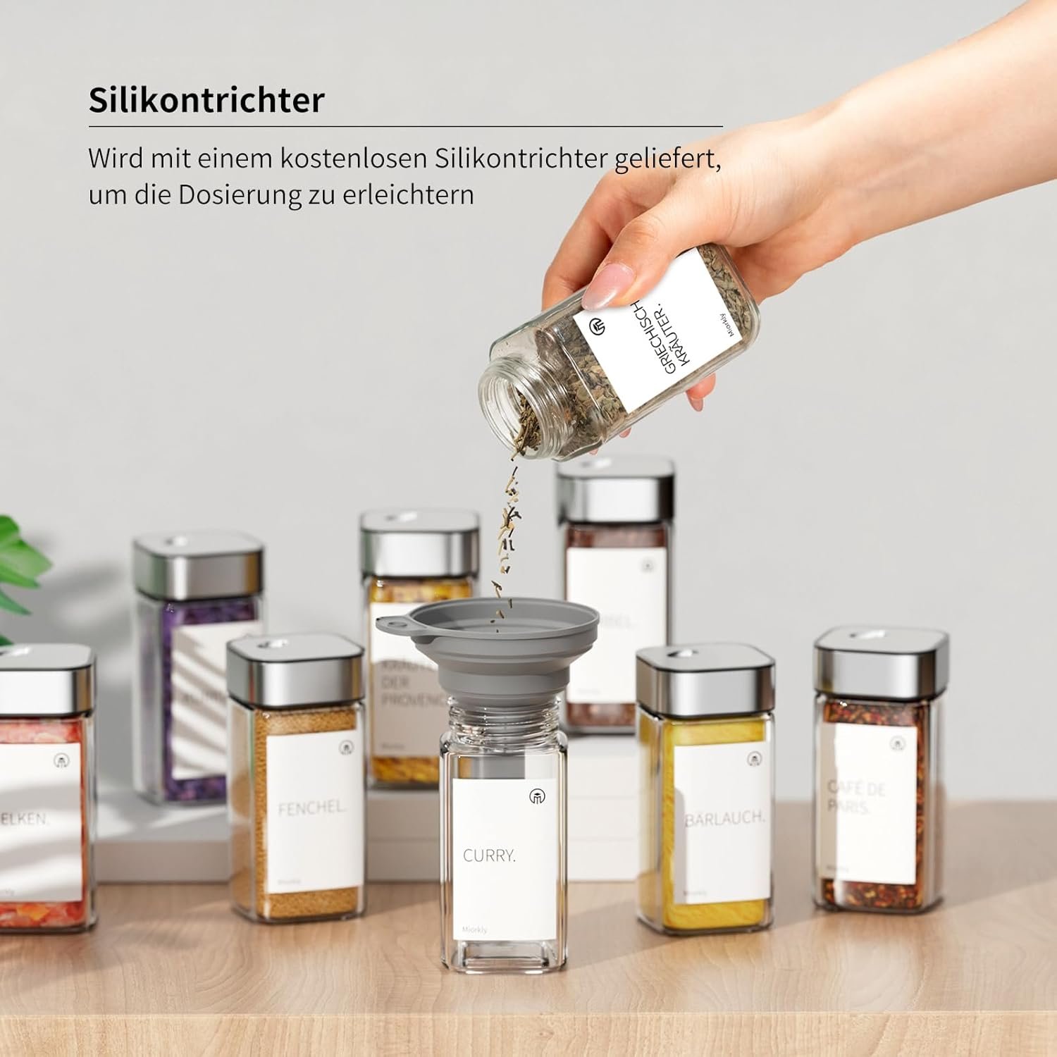 PERFECT FOR KITCHEN STORAGE: This product has a compact design of 120ml. It fits most spice racks, but you can also store it in drawers or cupboards to save space. Together with the matching stickers and labels, it is easier for you to