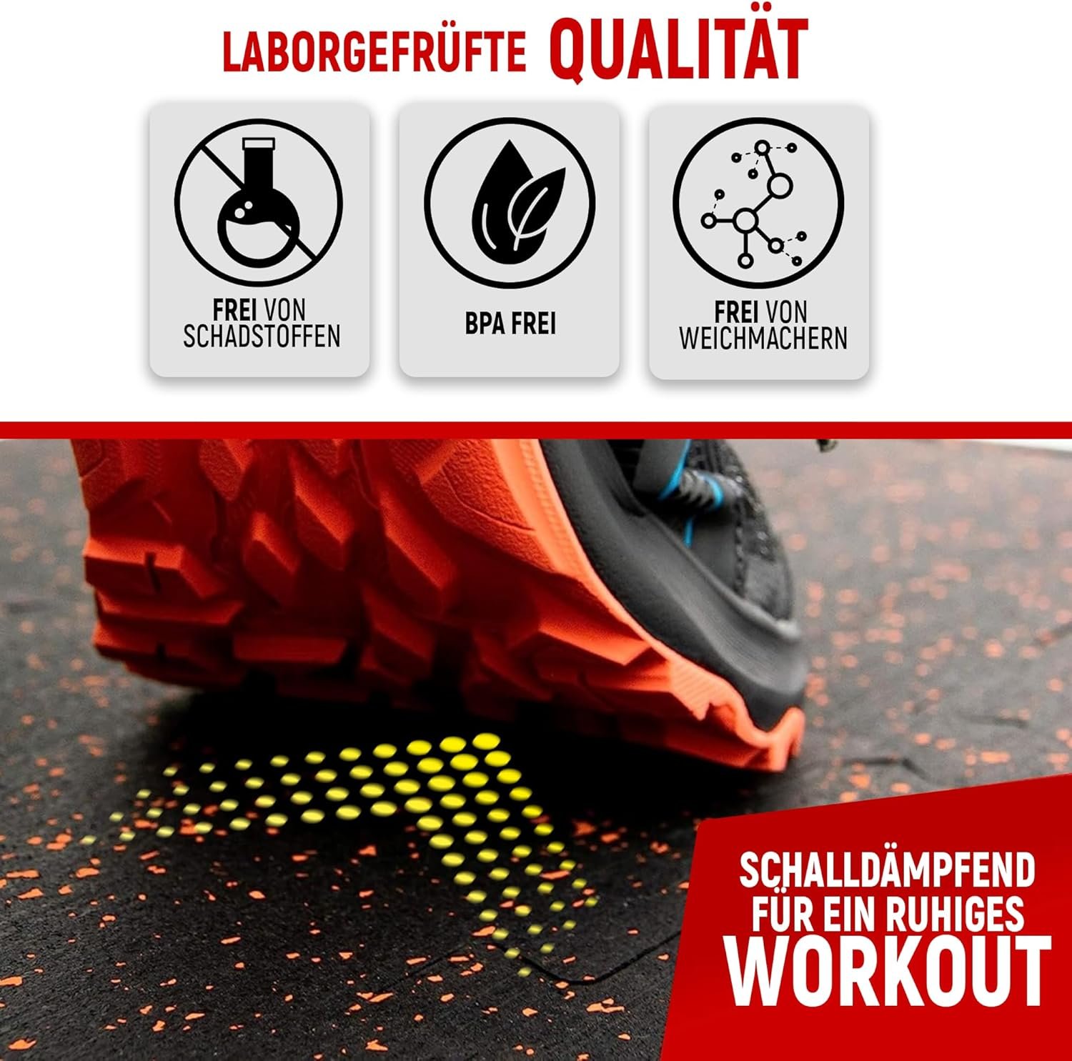 The NEOLYMP floor protection mats create a stable and durable training surface on a large area. Made of high-quality rubber, they are particularly robust, heavy and non-slip. The dense sports floor dampens noise, protects the joints and reliably protects your surface.