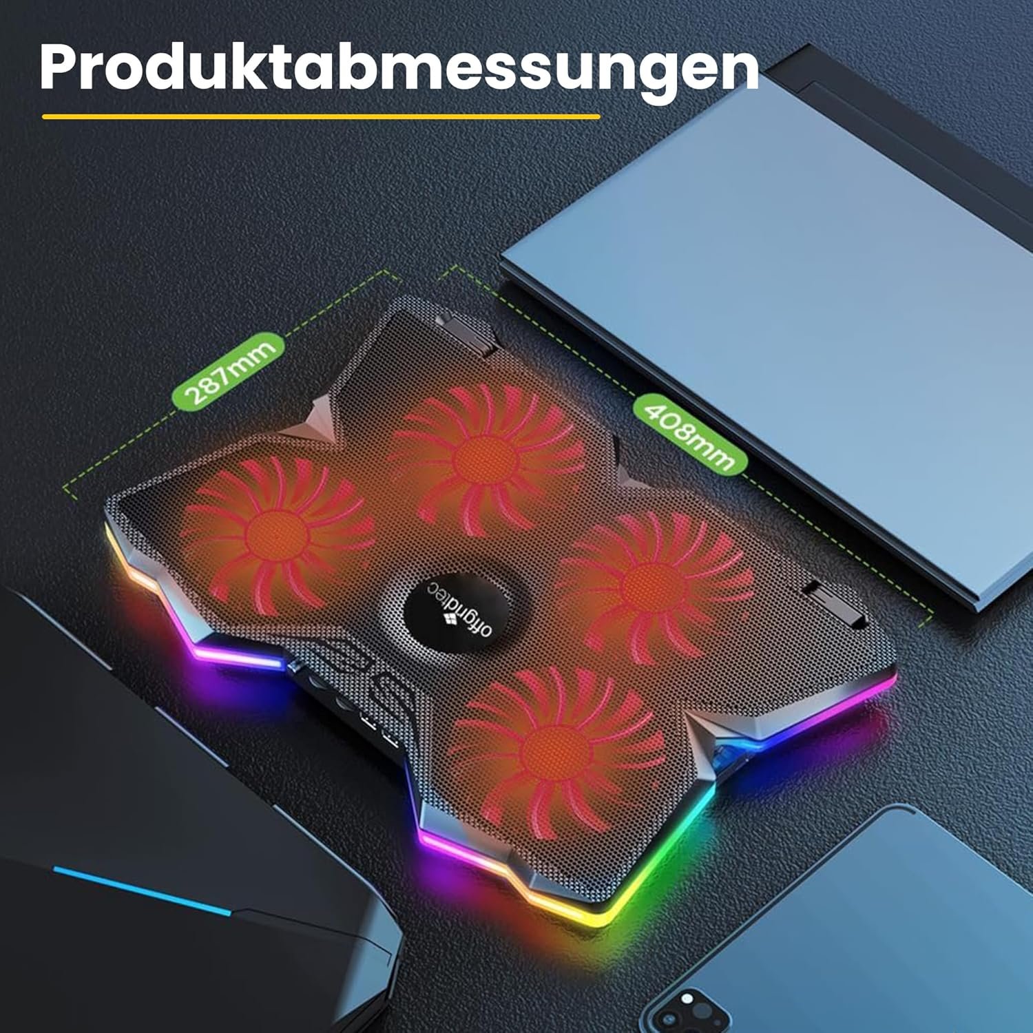Offgridtec Laptop Cooler K25 Pro – Ventilated Stand with 4 Quiet Fans at 1100 RPM, 2 USB Ports, Height Adjustable, Ergonomic Design for Gaming Consoles & Laptops – Red