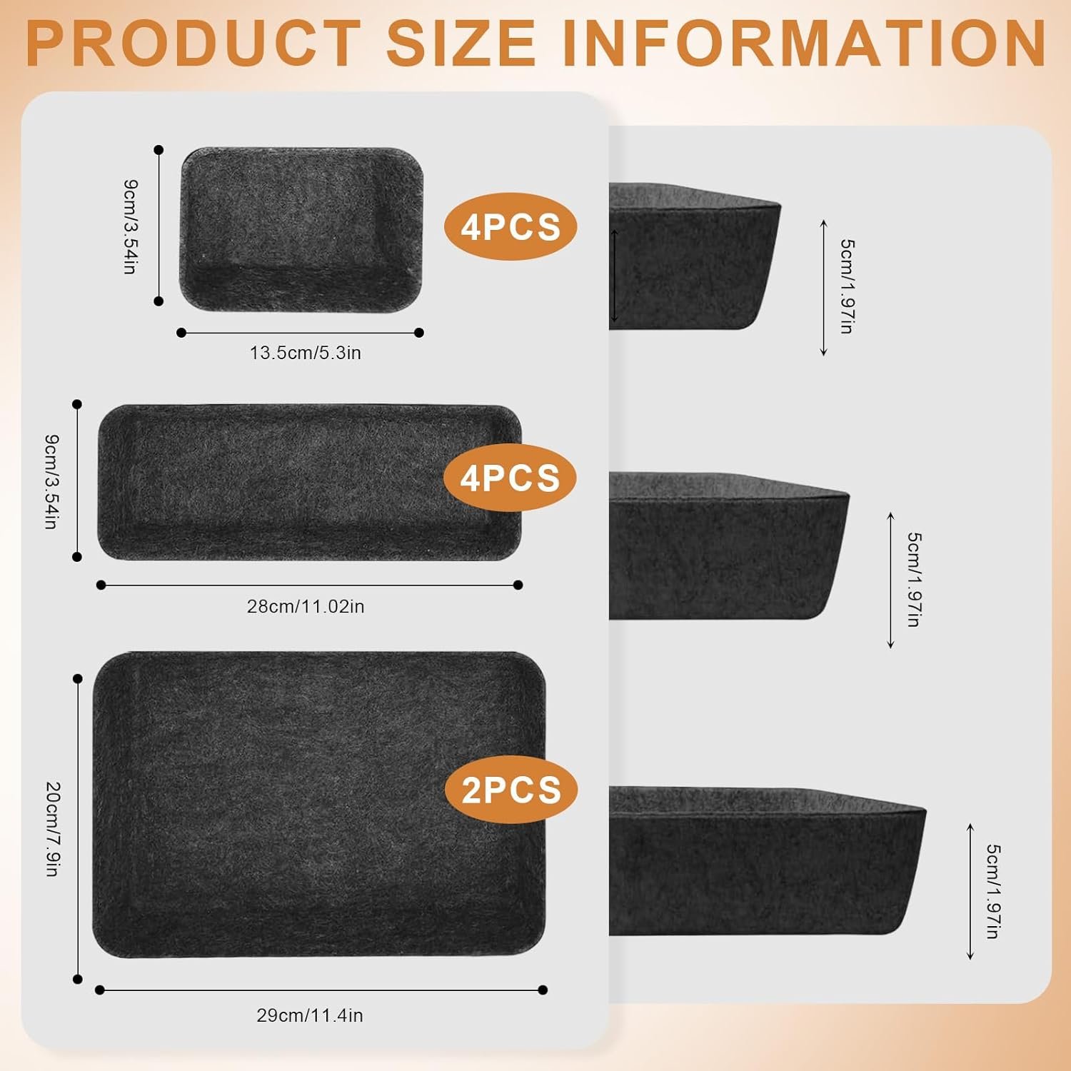 Flexible combination: this set contains 10 pieces. This set contains 2 XL (27.5 x 20 x 5.3 cm), 4 L (27 x 9.7 x 5.3 cm) and 4 M (13.5 x 9.3 x 5 cm) drawer organiser felt that you can freely combine according to your needs and preferences. Whether on the bedside table, desk or dressing table, you can arrange flexibly and create a custom storage solution.
