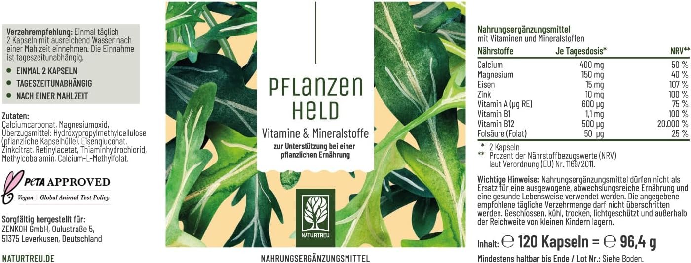 – Pflanzenheld is your companion for a plant-based diet. With B12, A, zinc, magnesium, calcium and iron, our multivitamin supports you easily and completely.