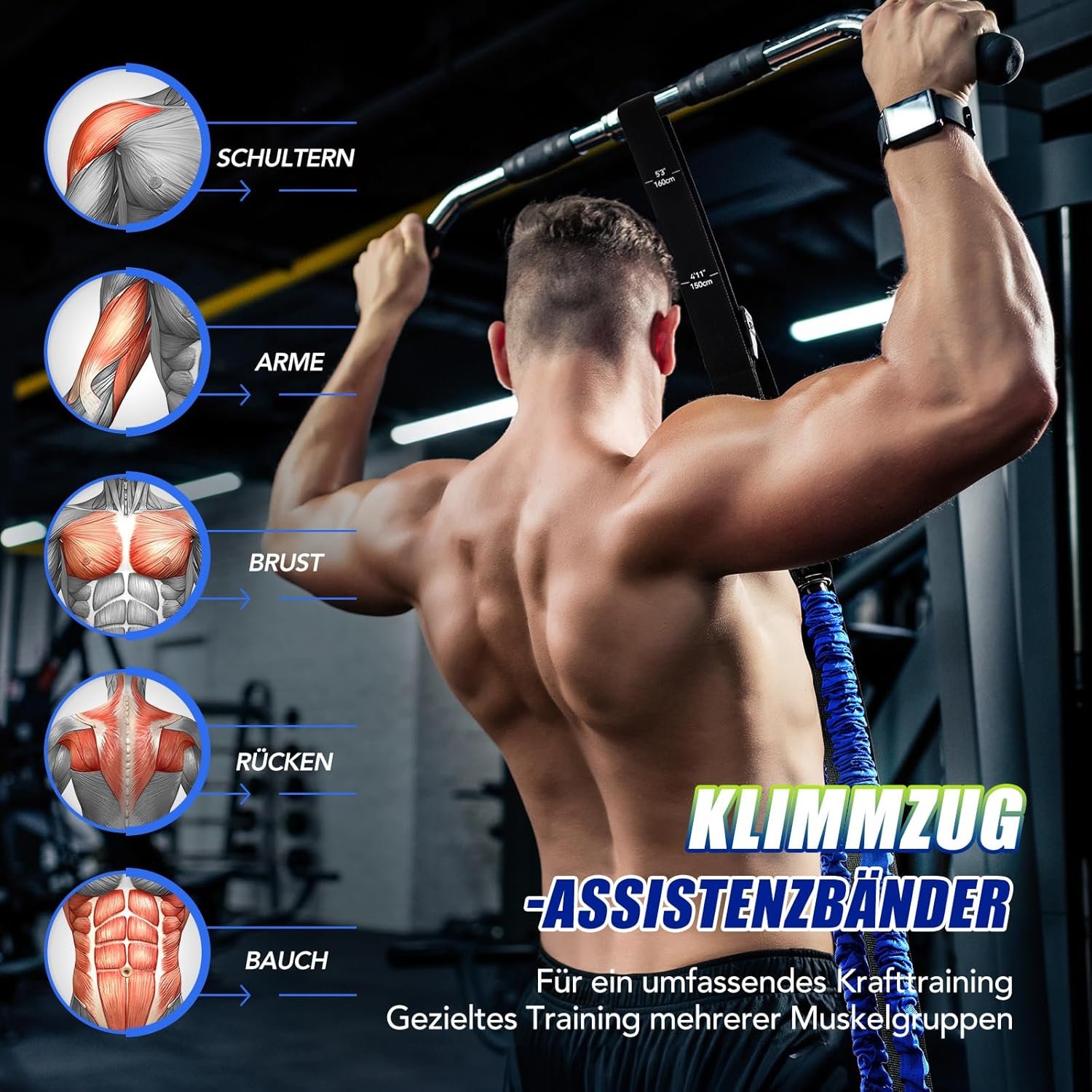Height-adjustable strap with length marking for central adjustment: The system contains a length-marked, individually adjustable strap that is suitable for users from 150 to 190 cm height. This ensures even tension and increases training efficiency. The easy attachment to any standard pull-up bar – whether at home, in the gym or outdoors – makes training particularly flexible.