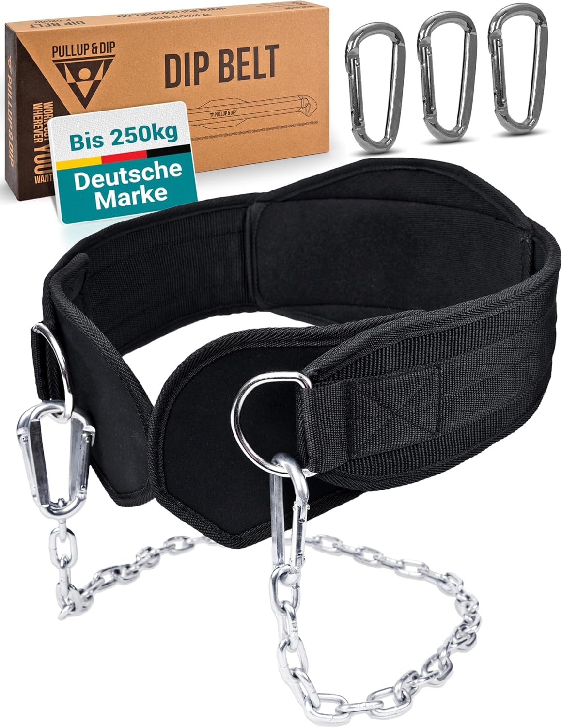 PULLUP & DIP Belt with Chain and 3 x Carabiners, Dip Belt Including Neoprene Flaps as Clothing Protection, Weight Belt, Weighted Belt, Pull-Up Belt for Calisthenics, Weight Training, Bodybuilding