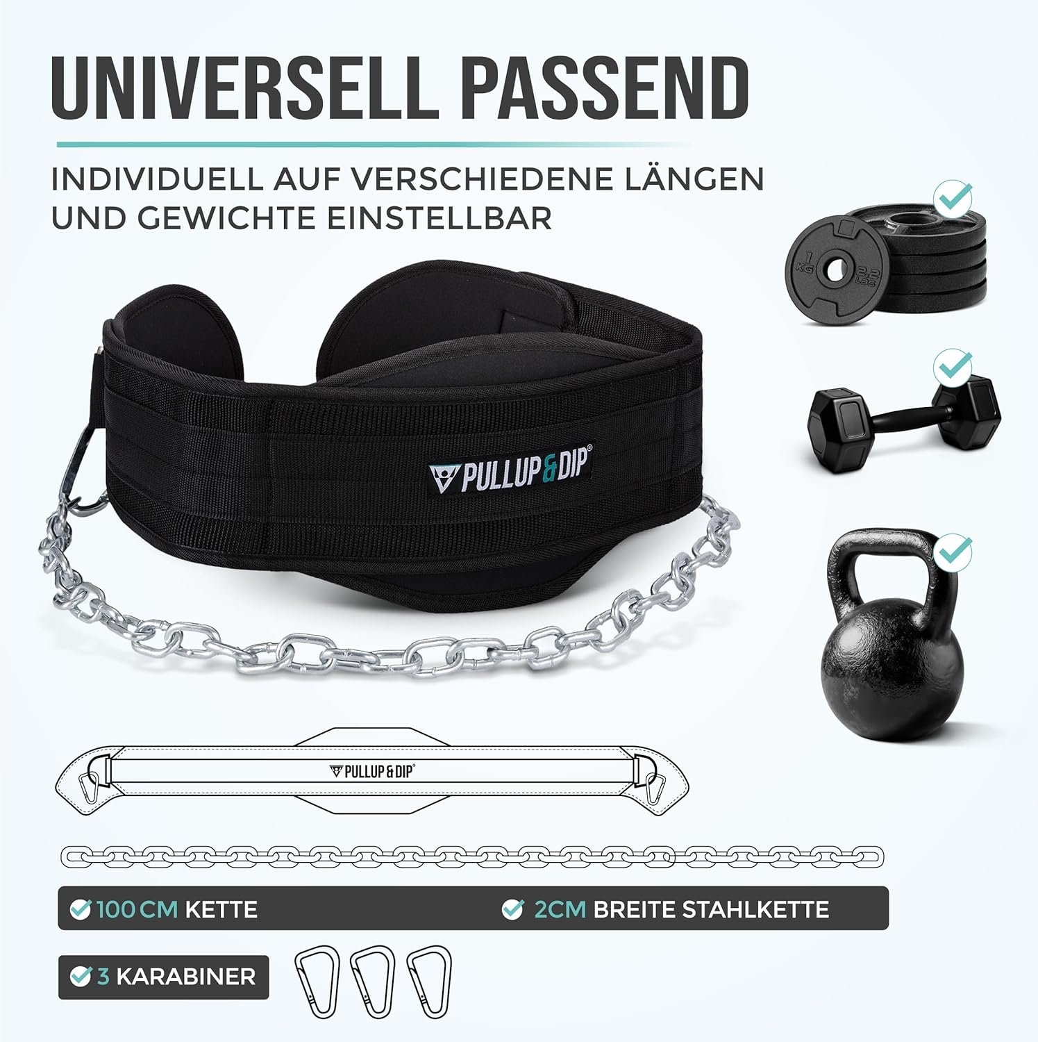 With steel chain + 3 carabiners: Included is a 100 cm long and 2 cm wide, chrome-plated chain made of high-quality steel and three carabiners. The weightlifting belt can therefore be individually adjusted to different lengths and weights. The chain is suitable for all standard weight plates. Thanks to the three carabiners and the chain links, the pull-up belt can be adjusted for any waist size and is therefore suitable for both men and women.