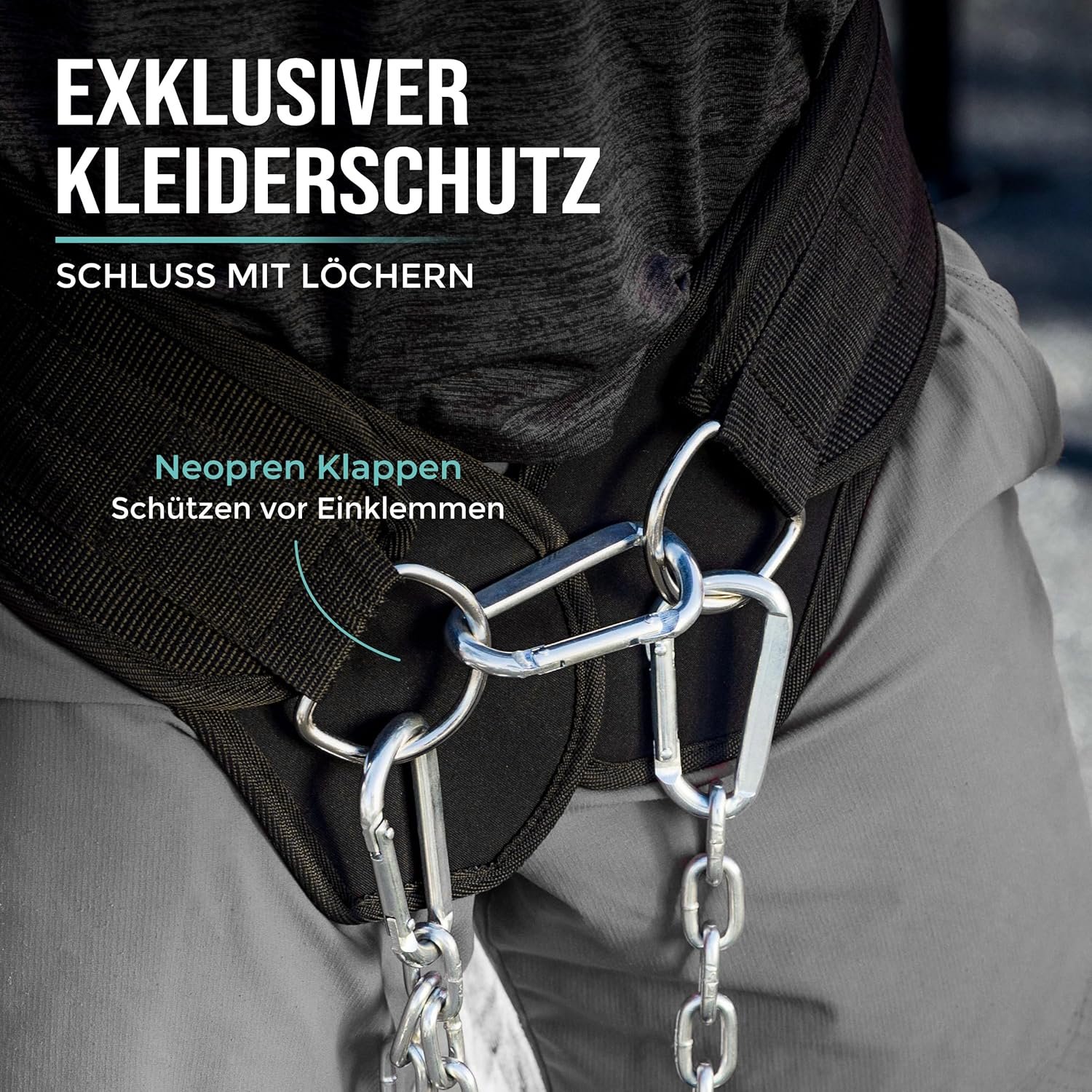 Comfortable and secure fit: thanks to the anatomical shape and the special materials, the dip belt sits very comfortably and does not cut in. The extra 15 cm wide, padded and reinforced back panel provides a perfect fit in the lumbar region. Even with additional weights of over 100 kg, a comfortable fit is guaranteed. The unique attached neoprene flaps protect your clothes from being trapped between the chain and carabiners and protect them from holes.