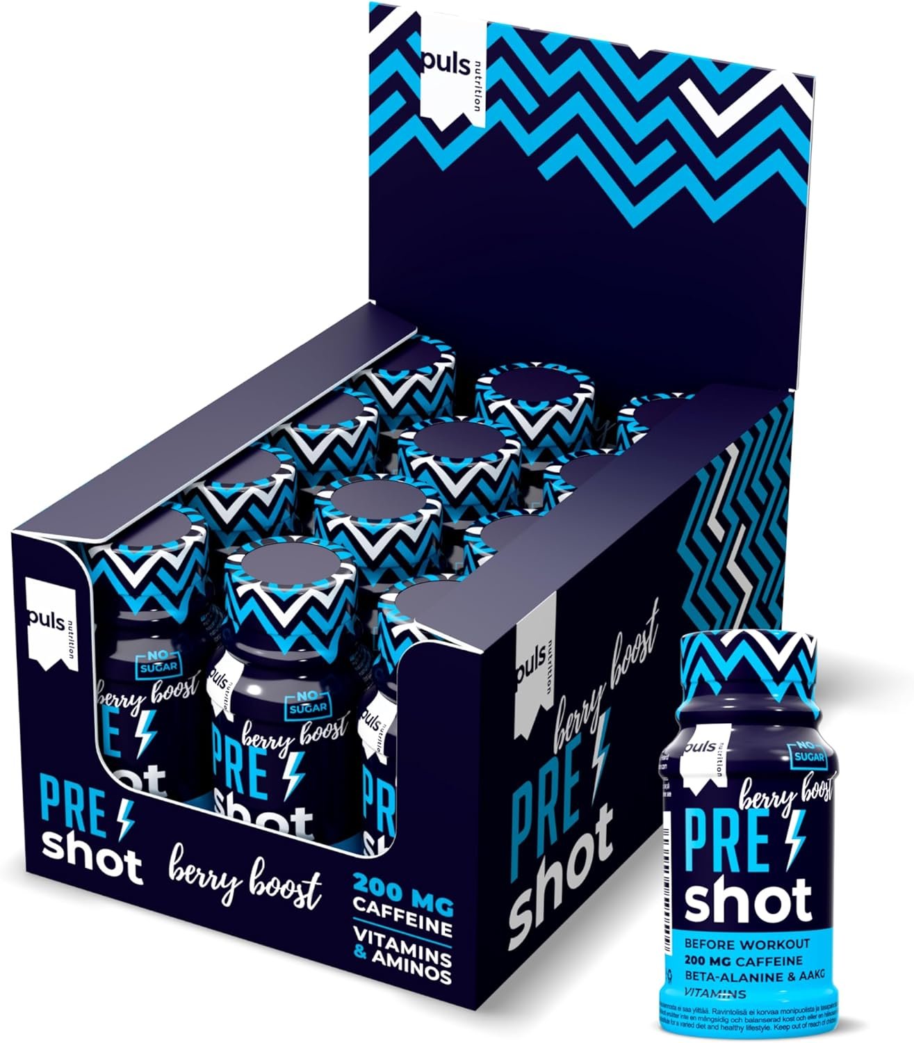 Experience the PULS Pre Workout Shot Berry Boost – your fruity booster pre workout for maximum energy, focus and endurance. With 200 mg of caffeine per shot, beta-alanine, arginine AKG and B vitamins, this pre-workout booster with caffeine is the perfect choice for intense training sessions in the gym, football or other sports. Powerful formula Beta-Alanine supports your muscle endurance, while Arginine AKG promotes blood circulation – for more pump and training efficiency. Vitamin B6 and B12 contribute to normal energy metabolism, reduce fatigue and help you stay focused longer. Practical and ready to drink This handy caffeine shot in 60 ml format is the ideal workout booster for on the go – simply drink 30 minutes before training and get full power. Taste & Quality With its intense berry mix, the Berry Boost Pre Workout Shot delivers not only performance, but also refreshing fruit flavour – perfect for athletes who want to combine enjoyment and performance. Application and instructions: 1 shot approx. 30 minutes. drink before training. Not recommended for children, pregnant women, breastfeeding or caffeine-sensitive people. Store in a cool and dry place, away from direct sunlight.
