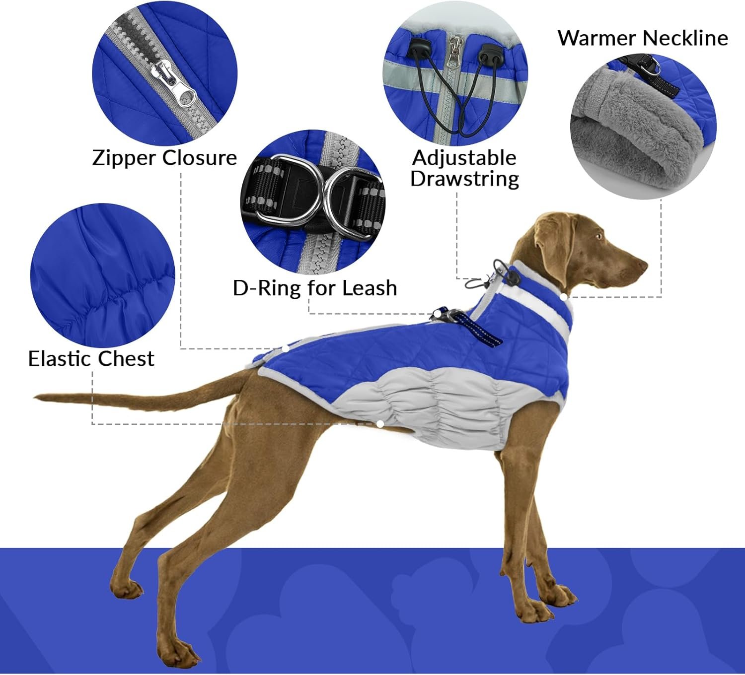 Reflective and D-ring: Reflective strips on the neckline of the waterproof dog jacket can improve visibility in low-light conditions. On the back of the dog winter coat there are double strong metal D-rings that can be attached to the lead, making walking the dog more comfortable.