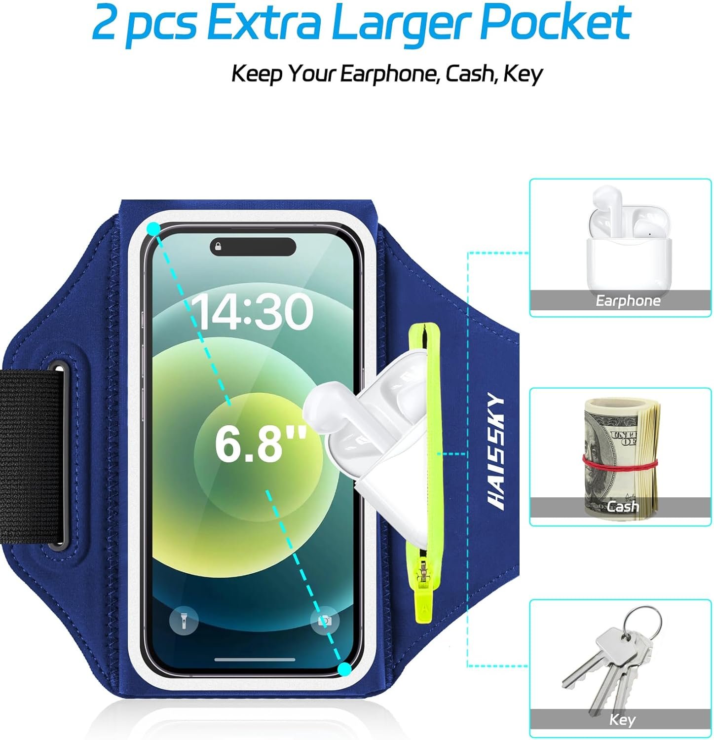 2 extra pockets: mobile phone holder jogging with 2 additional pockets for airpods/headphones/house or car keys. Back card pocket for credit cards/money.